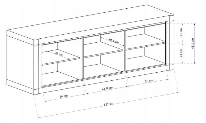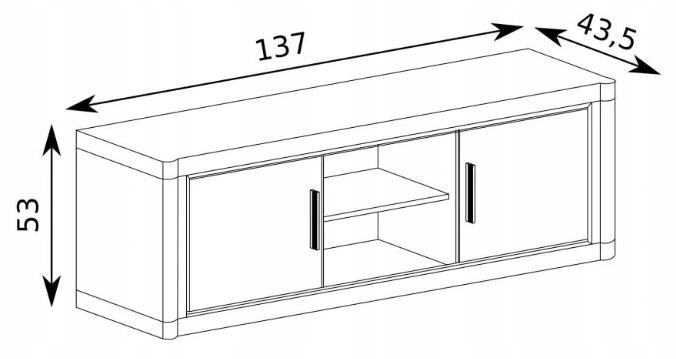 Szafka RTV o szerokości 137 cm świetnie sprawdzi się w salonie jako funkcjonalna podstawa pod telewizor. Przestronne półki i zamykane szafki umożliwiają wygodne przechowywanie sprzętu multimedialnego, kabli i akcesoriów, pomagając utrzymać porządek w strefie rozrywki.