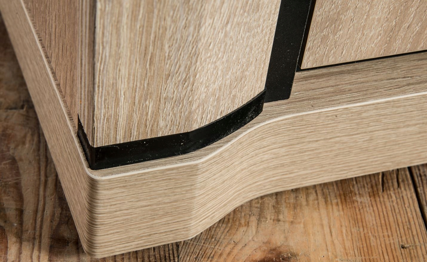 Mebel został wykonany z trwałej płyty laminowanej, a jego solidność podkreślają grube blaty górne i dolne (48 mm) oraz blendy boczne (32 mm). Krawędzie zabezpieczone obrzeżem ABS zapewniają trwałość i estetyczne wykończenie. Dzięki przemyślanej konstrukcji, szafka RTV DALLAS łączy nowoczesny design z komfortem użytkowania.