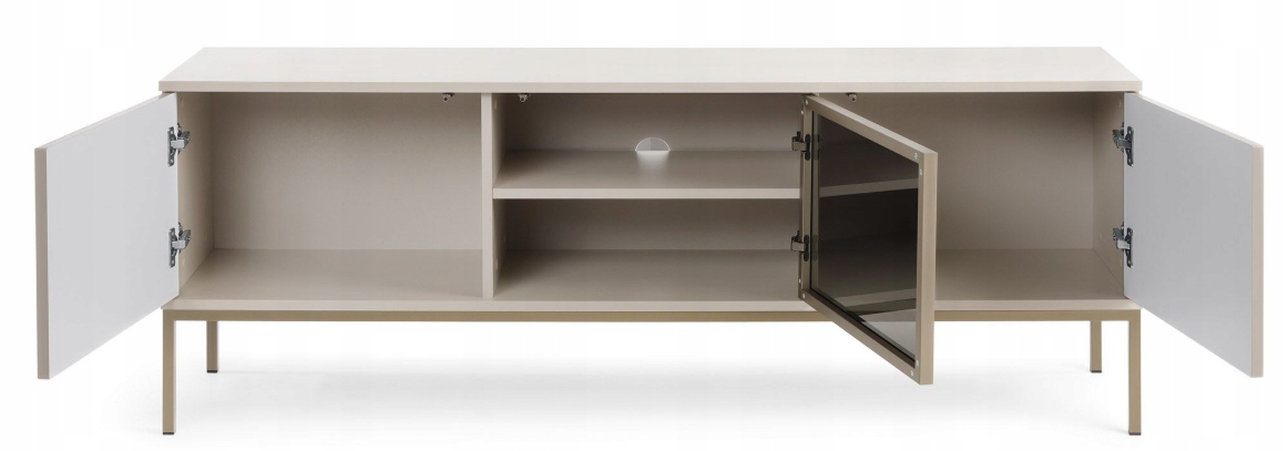 Charakterystycznym elementem kolekcji są smukłe, złote metalowe nóżki o wysokości 20 cm, które nadają meblom lekkości i elegancji. Drzwi otwierają się za pomocą systemu PUSH TO OPEN, co pozwala zachować czystą formę frontów – idealną do minimalistycznych wnętrz.