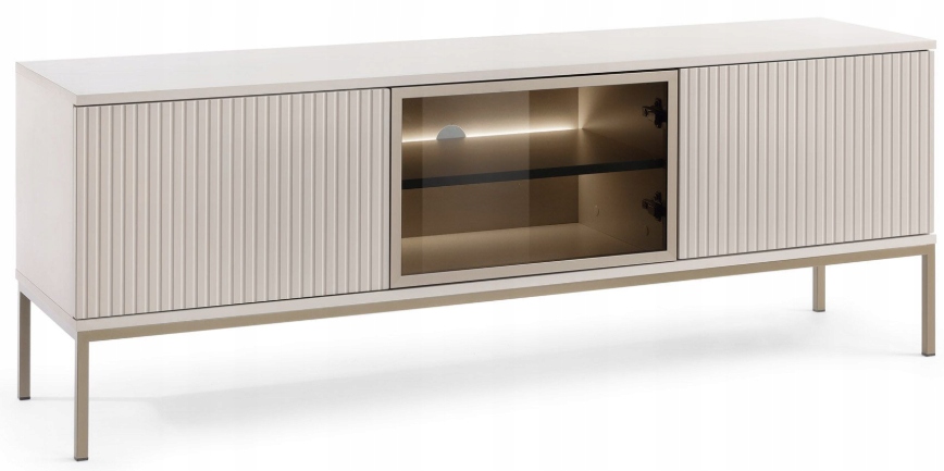 Gładkie powierzchnie korpusu i frontów w jednolitym kolorze kaszmir współgrają z pionowym, designerskim frezowaniem, które dodaje bryłom głębi i wyrafinowania. Frezowane fronty z płyty MDF o grubości 18 mm podkreślają wysoką jakość wykonania, a korpusy z płyty laminowanej z obrzeżem ABS zapewniają trwałość na lata.