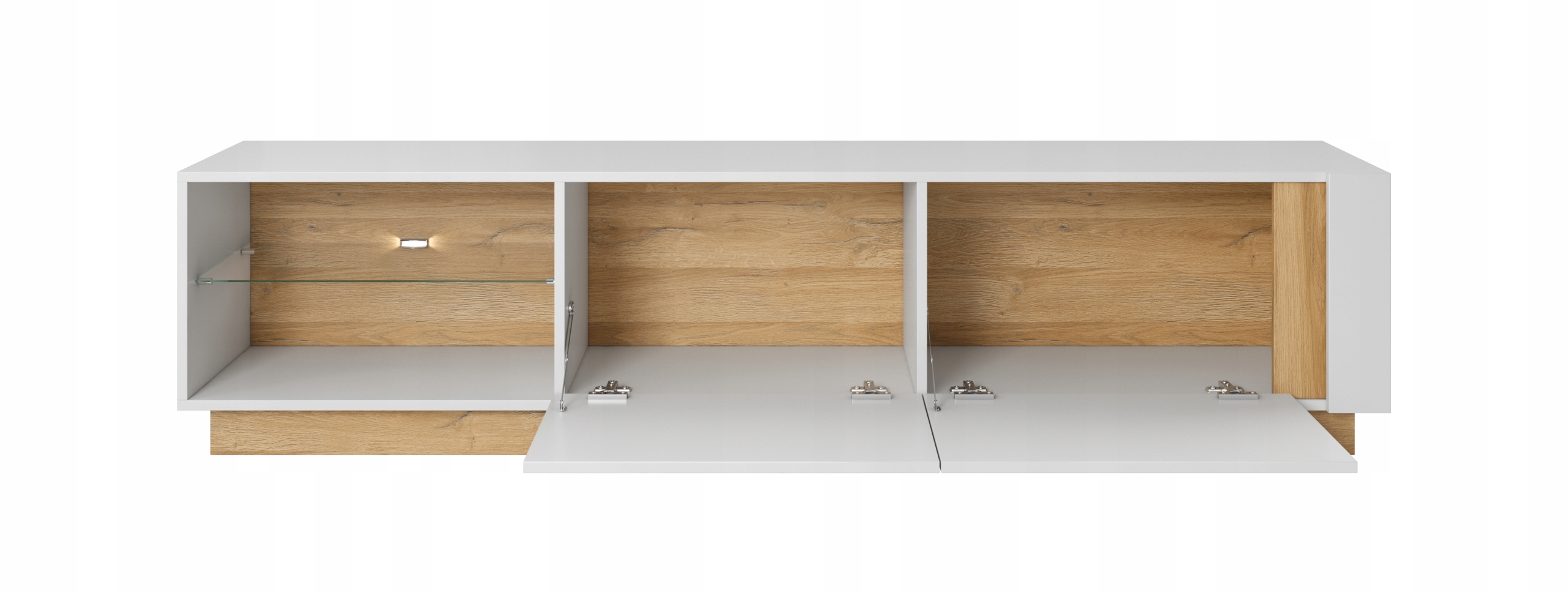 Szafka RTV z kolekcji ARCO to idealne rozwiązanie do nowoczesnego salonu lub pokoju dziennego, oferujące zarówno styl, jak i funkcjonalność. Wyposażona w dwie pojemne klapy oraz szklaną półkę, szafka zapewnia przestrzeń na sprzęt RTV oraz dekoracje, doskonale organizując strefę multimedialną. Wykończenie w białym połysku na frontach, połączone z matowym korpusem i eleganckim akcentem w kolorze dąb grandson, nadaje jej nowoczesny i przytulny charakter, który znakomicie wkomponuje się w każdą aranżację.