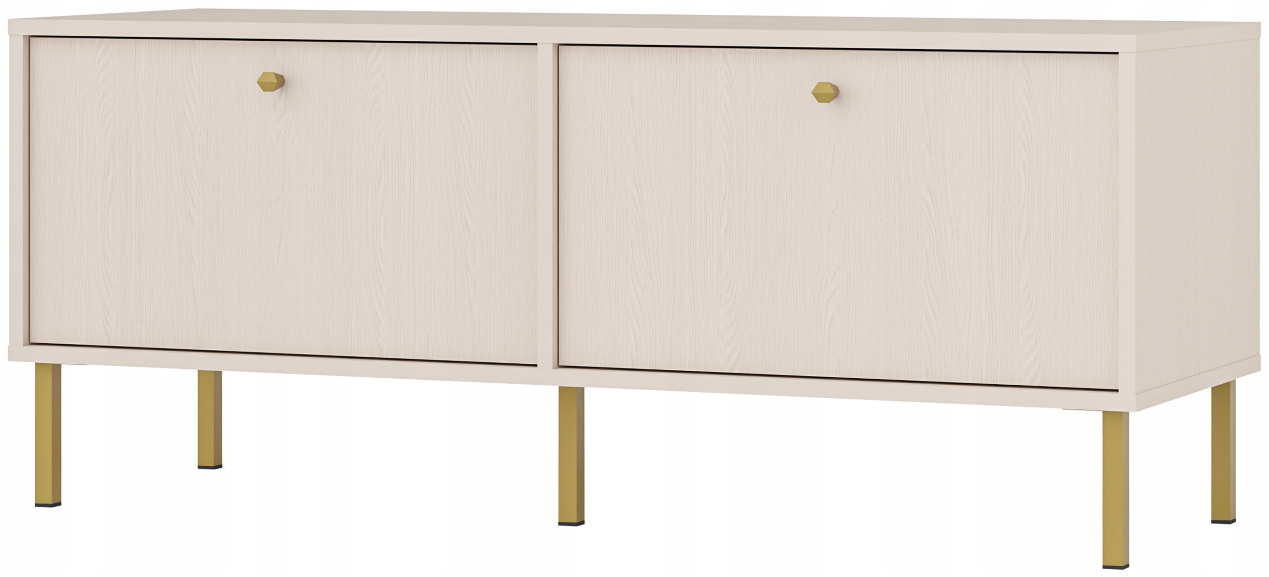 Szafka RTV AVILA wyróżnia się złotymi, metalowymi nóżkami i uchwytami, które dodają luksusowego charakteru i stabilności, a także ułatwiają utrzymanie czystości pod meblem. Konstrukcja z wytrzymałej płyty laminowanej i zabezpieczone krawędzie ABS gwarantują odporność na uszkodzenia i trwałość na lata.