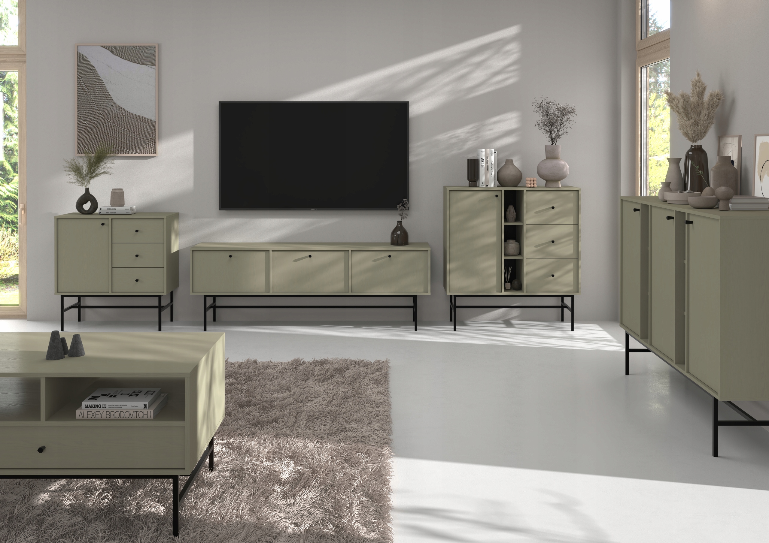 Szafka RTV AVILA o szerokości 120 cm to elegancka propozycja do nowoczesnych wnętrz, idealna jako centrum rozrywki w salonie. Kolor eukaliptus doskonale wpasowuje się w różnorodne aranżacje, wprowadzając świeżość i harmonię do przestrzeni. Metalowe czarne nogi oraz uchwyty dodają meblowi stylu i zapewniają stabilność, a także łatwość utrzymania czystości.