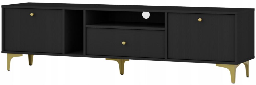 Szafka RTV z kolekcji AVILA to połączenie stylu i praktyczności. Ta szeroka szafka pod telewizor o długości 180 cm wyróżnia się eleganckimi złotymi metalowymi nóżkami i uchwytami, które nadają meblowi nowoczesnego, a jednocześnie ponadczasowego charakteru. Wyposażona w dwie klapy, pojemną szufladę oraz dwie funkcjonalne półki, oferuje przestrzeń do przechowywania sprzętu i akcesoriów, zapewniając wygodny dostęp i uporządkowany wygląd w salonie.