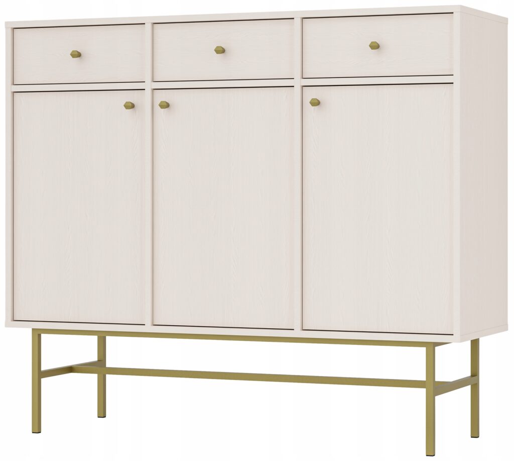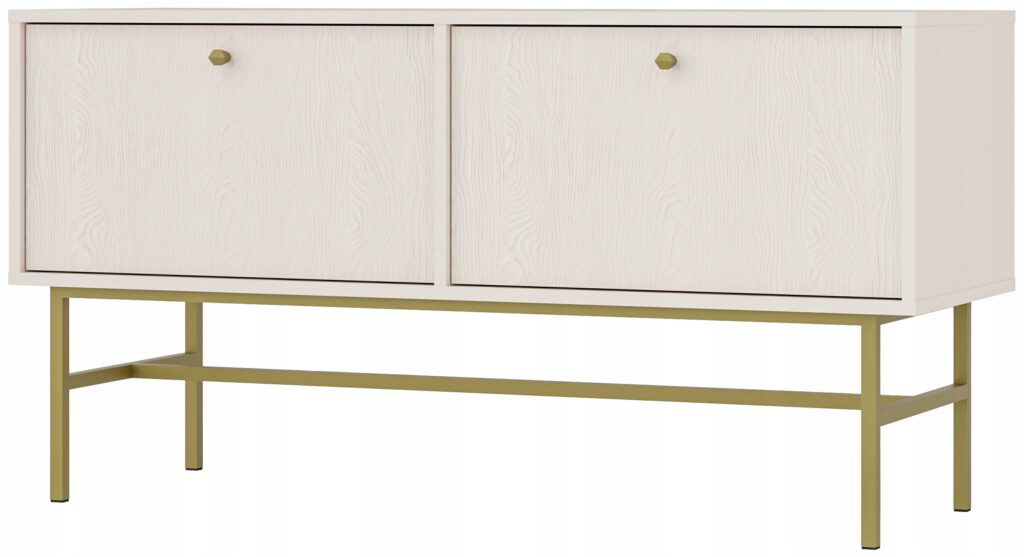 Ten stolik RTV to nie tylko praktyczny mebel, ale także ozdoba wnętrza. Ciepła, beżowa kolorystyka korpusu doskonale współgra z różnorodnymi aranżacjami, nadając wnętrzu przytulny i harmonijny wygląd. Dzięki metalowym nogom o wysokości 27,5 cm, całość nabiera lekkości, a dodatkowo łatwiej utrzymać porządek pod meblem.