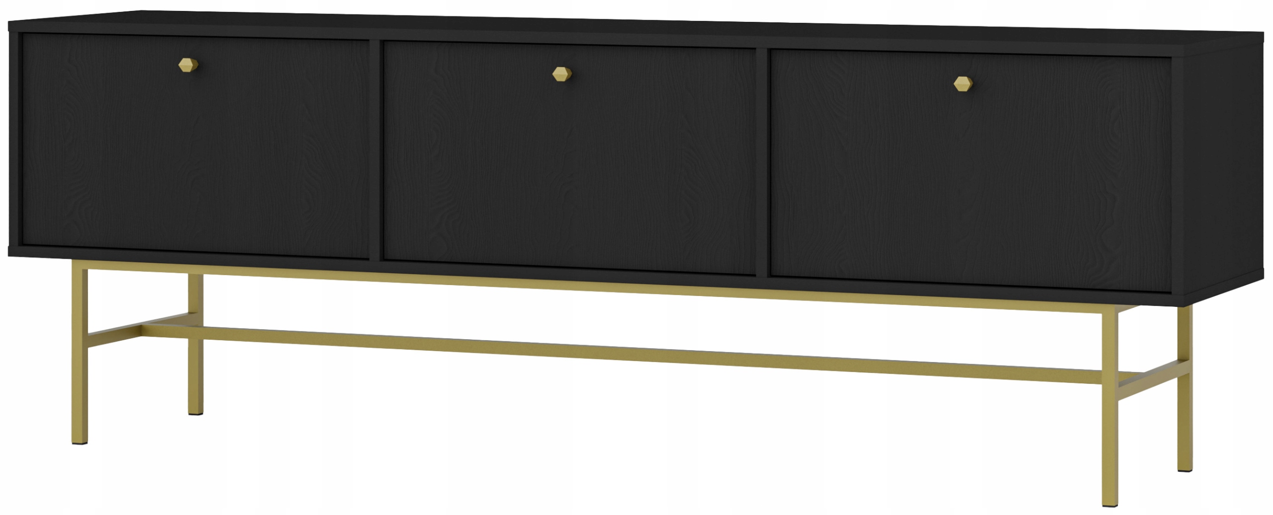 Stolik RTV AVILA to połączenie nowoczesnej elegancji i funkcjonalności, które doskonale wpasowuje się w wystrój salonu lub pokoju dziennego. Wykonany w głębokim odcieniu czarnego grafitu, stolik pod telewizor wyróżnia się nie tylko elegancją, ale również solidnym wykonaniem, które gwarantuje trwałość na lata. Złote, metalowe uchwyty i stelaż nadają meblowi wyrafinowanego charakteru, a ich minimalistyczne linie idealnie podkreślają nowoczesny styl wnętrza. Trzy klapy skrywają przestronną sekcję przechowywania, co sprawia, że AVILA to nie tylko szafka pod telewizor, ale również praktyczne miejsce na organizację sprzętu RTV, pilotów czy kabli, dbając o porządek i estetykę.