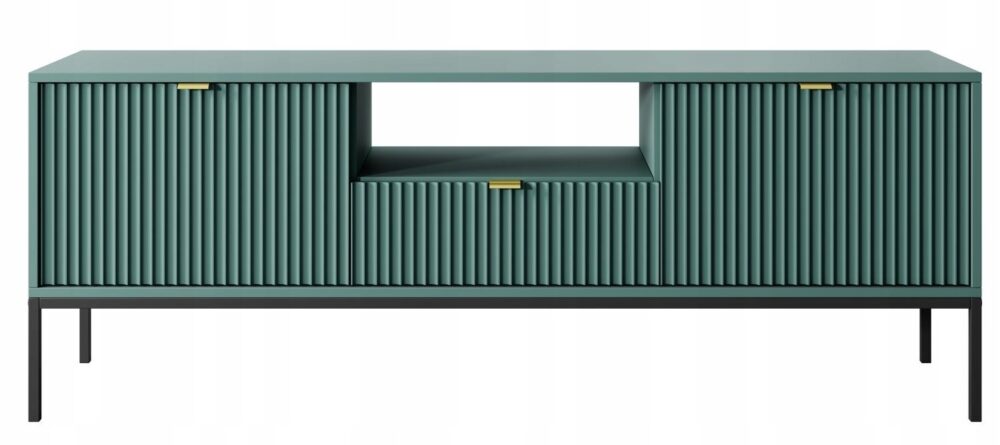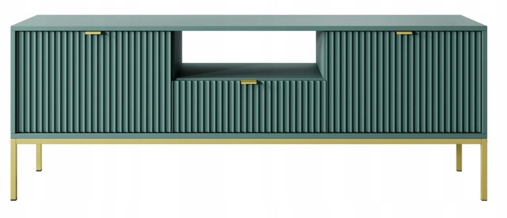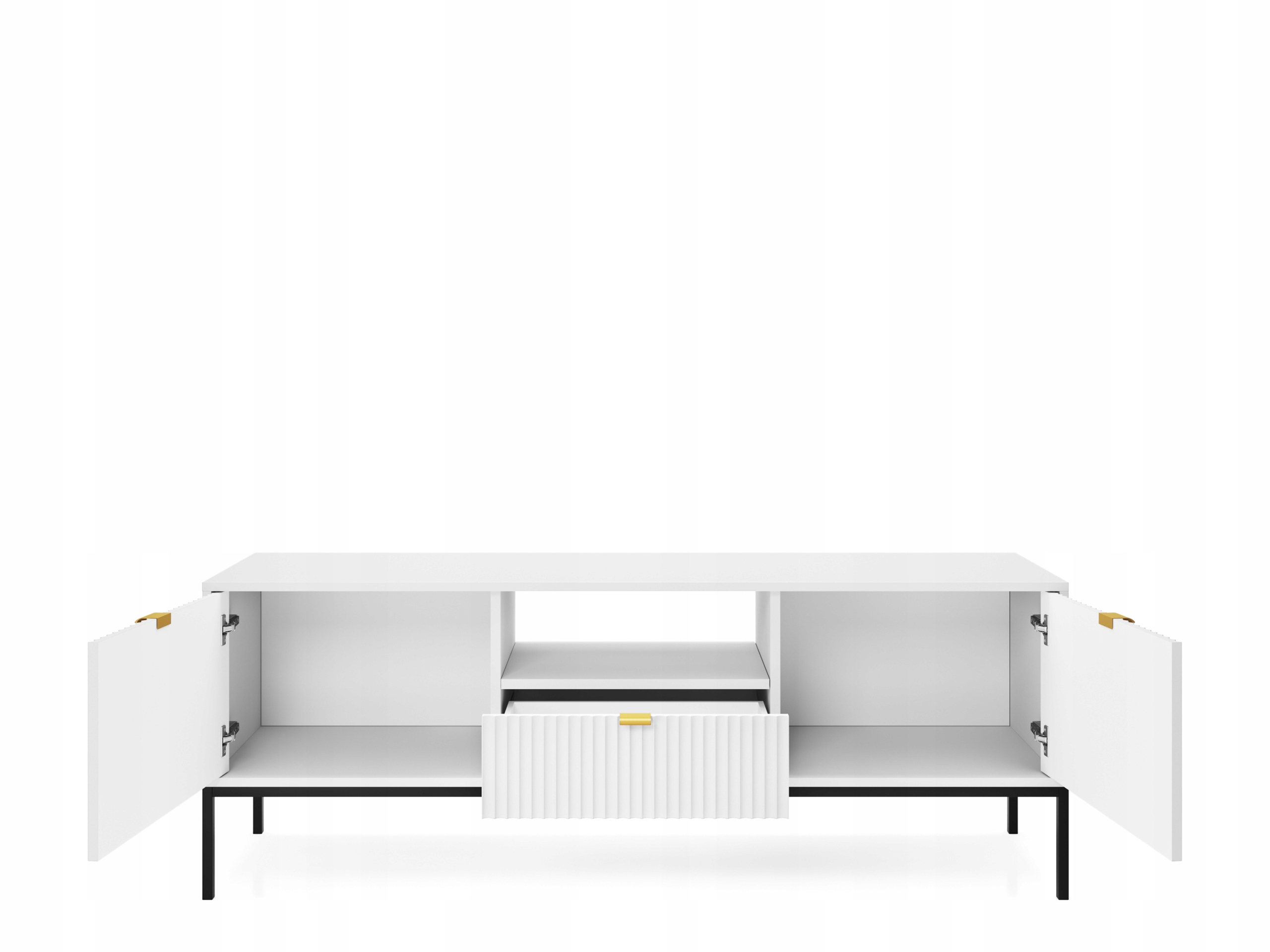 Szafka RTV z kolekcji BELLAZA to doskonałe połączenie nowoczesnego designu i funkcjonalności. Wyposażona w szufladę, półkę i dwoje drzwi, zapewnia nie tylko estetyczny wygląd, ale również praktyczne rozwiązania do przechowywania. Frezowane fronty i eleganckie złote uchwyty dodają jej wyjątkowego charakteru, sprawiając, że będzie ozdobą każdego wnętrza.