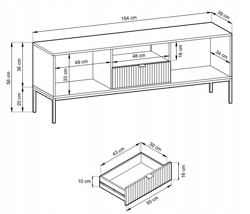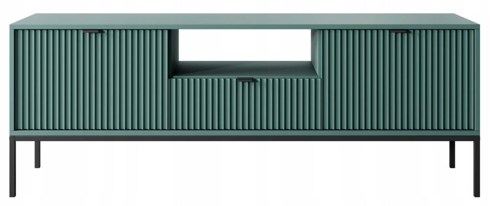 Stolik pod telewizor, świetnie sprawdzi się w salonie, pokoju dziennym czy gabinecie. Dzięki solidnej konstrukcji oraz metalowym nóżkom w kolorze czarnym, mebel jest trwały, stabilny, a jego 14-centymetrowe nóżki ułatwiają sprzątanie, również za pomocą odkurzacza automatycznego.