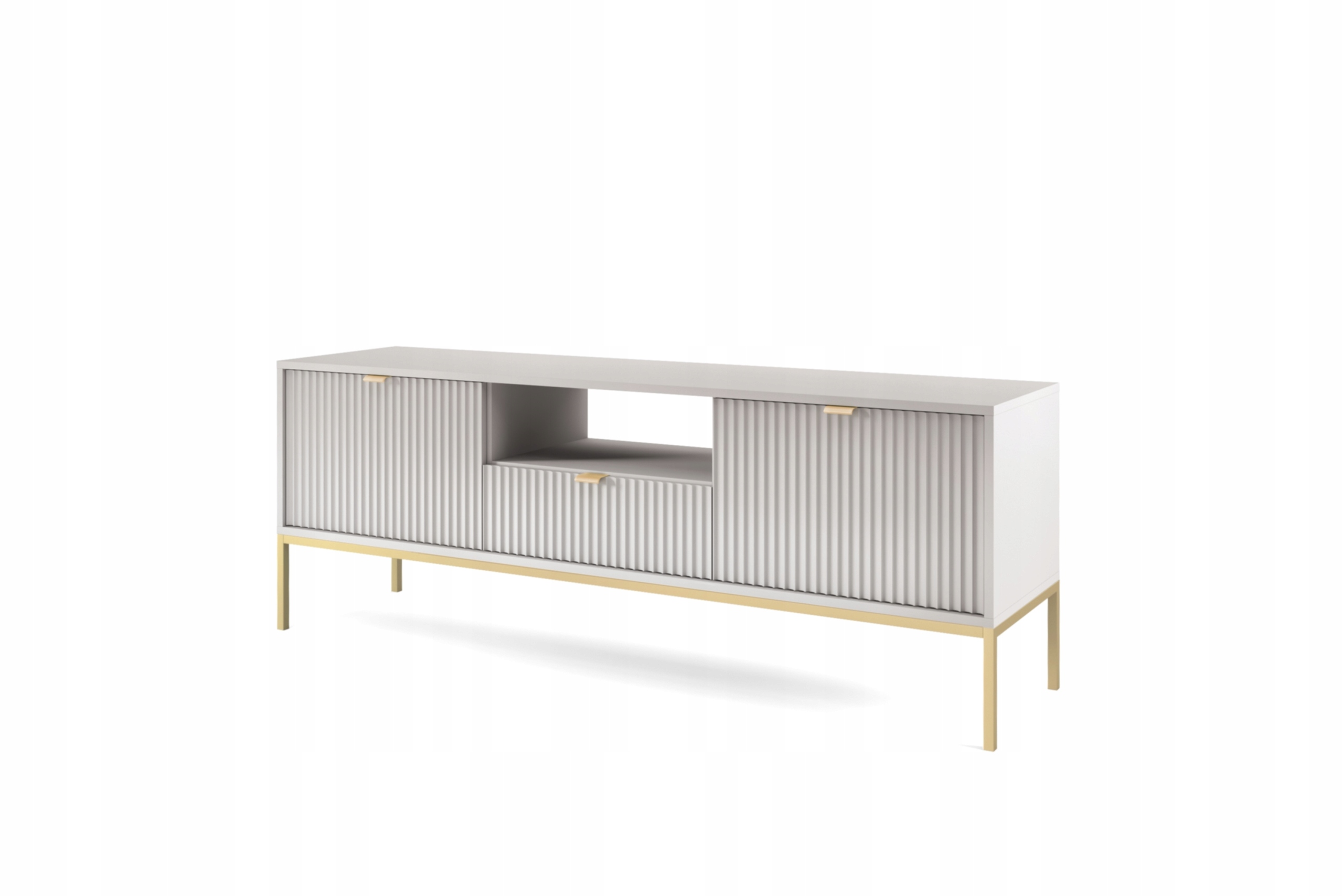 Szafka RTV z kolekcji BELLAZA to połączenie nowoczesnego designu z wysoką funkcjonalnością, idealne do każdego wnętrza, od salonu po gabinet. Zastosowane ryflowane fronty nadają meblowi elegancji, a złote uchwyty i metalowe nóżki tworzą luksusowy, ale minimalistyczny wygląd, który świetnie wpisuje się w styl loftowy.