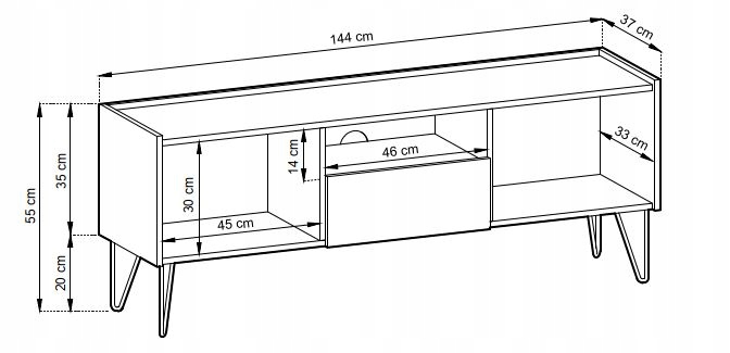 Szafka pod telewizor HARMONY to połączenie funkcjonalności i nowoczesnego designu, idealna do salonu. Dzięki dwóm drzwiczkom, szufladzie oraz półce pod blatem, zapewnia mnóstwo miejsca do przechowywania różnorodnych urządzeń elektronicznych, takich jak dekoder, konsola do gier, czy inne akcesoria. Dodatkowo, szafka posiada otwór na kable, co ułatwia organizację i zapobiega ich plątaniu.