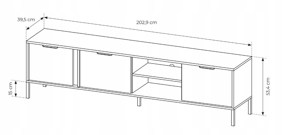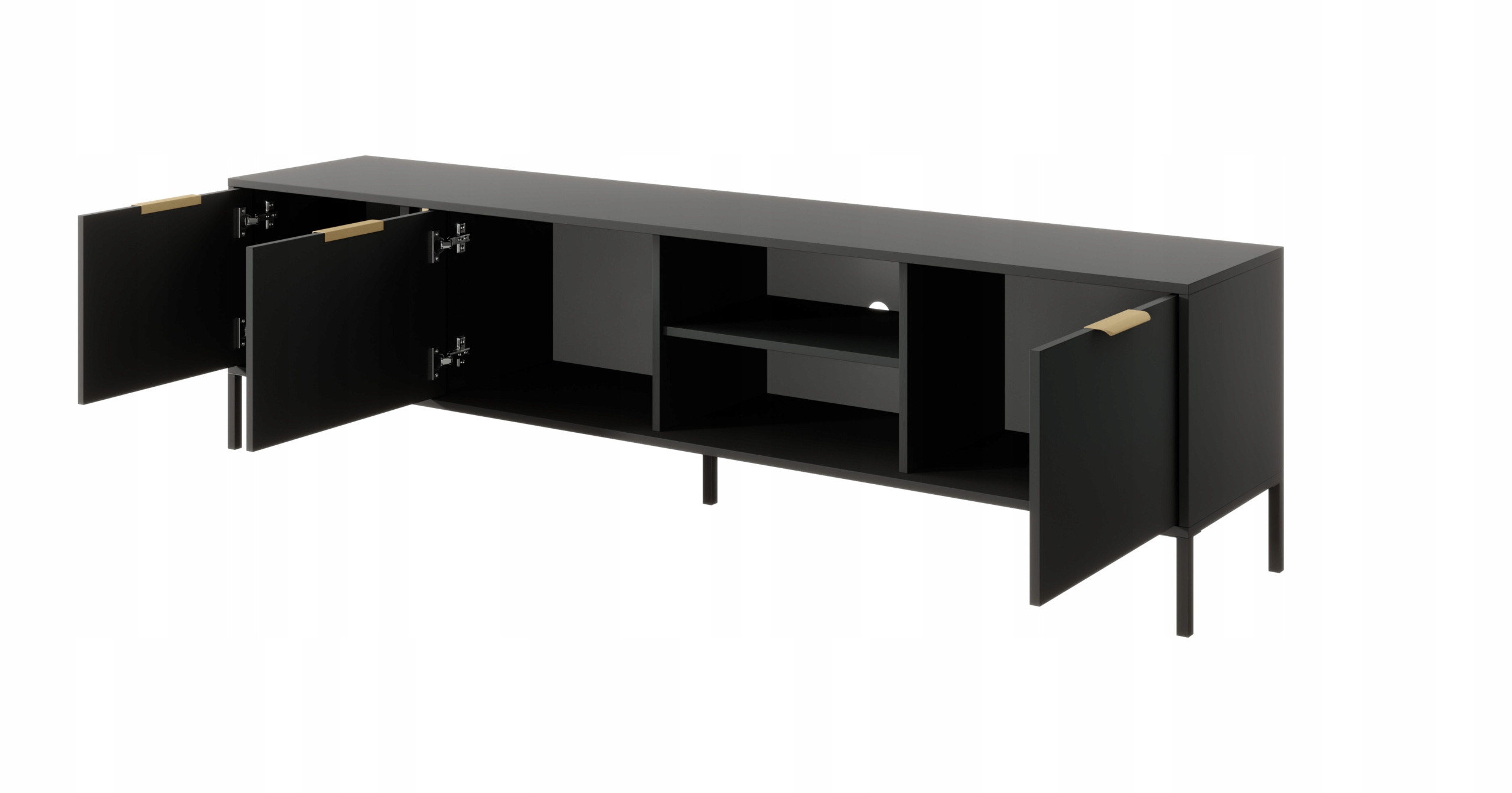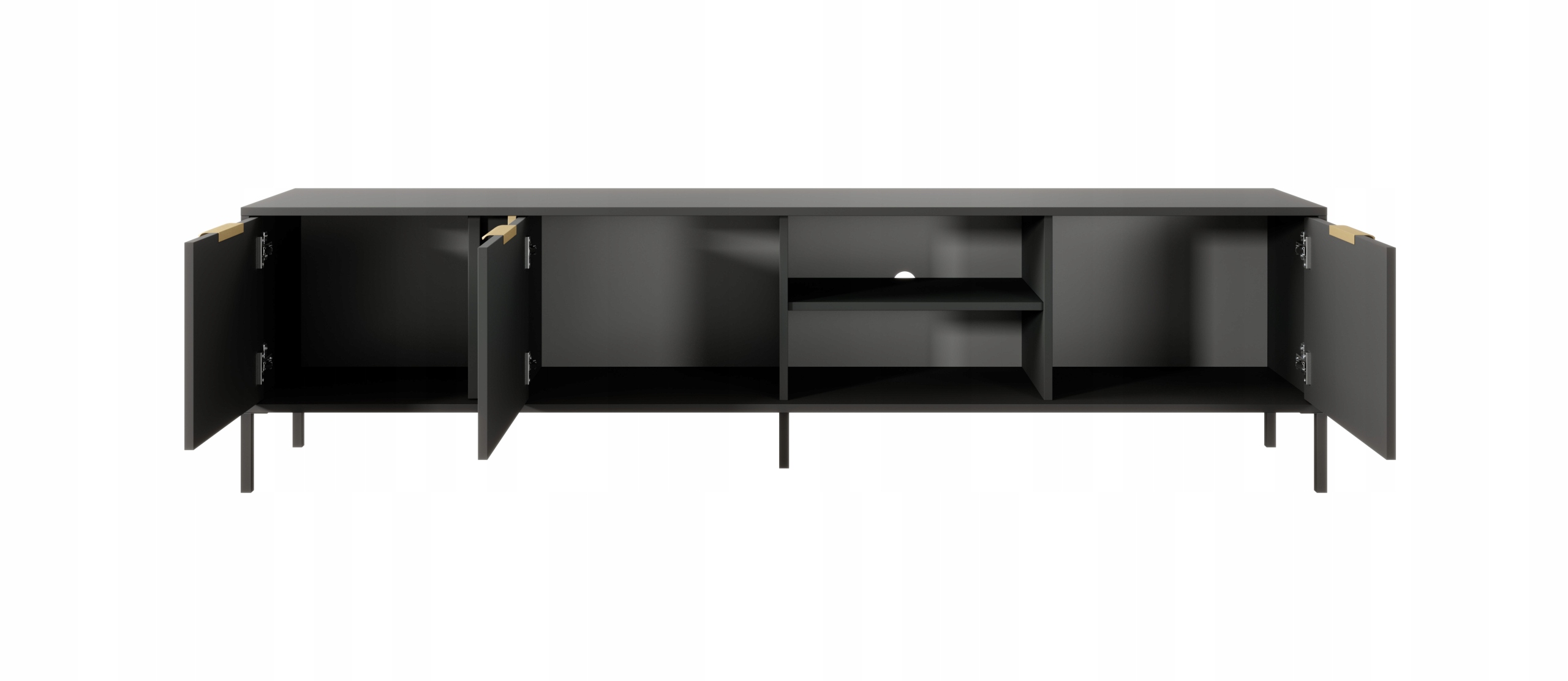 Szafka RTV LARS to wyjątkowy wybór dla miłośników eleganckiego i funkcjonalnego designu. Jej antracytowy korpus oraz złote dodatki natychmiast przyciągają wzrok, nadając wnętrzu wyjątkowy styl i elegancję. Idealna jako stolik pod telewizor, szafka o szerokości 203 cm zapewnia obszerną przestrzeń na sprzęt RTV oraz inne drobiazgi.