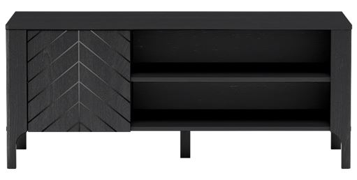 Kolekcja MALUBA zachwyca czarnymi, matowymi korpusami i frontami, ozdobionymi eleganckim wzorem jodełki, wykonanym precyzyjną metodą nadruku UV. Subtelny połysk wzoru pięknie kontrastuje z matową powierzchnią, podkreślając widoczne słoje drewna i nadając meblowi luksusowego charakteru.