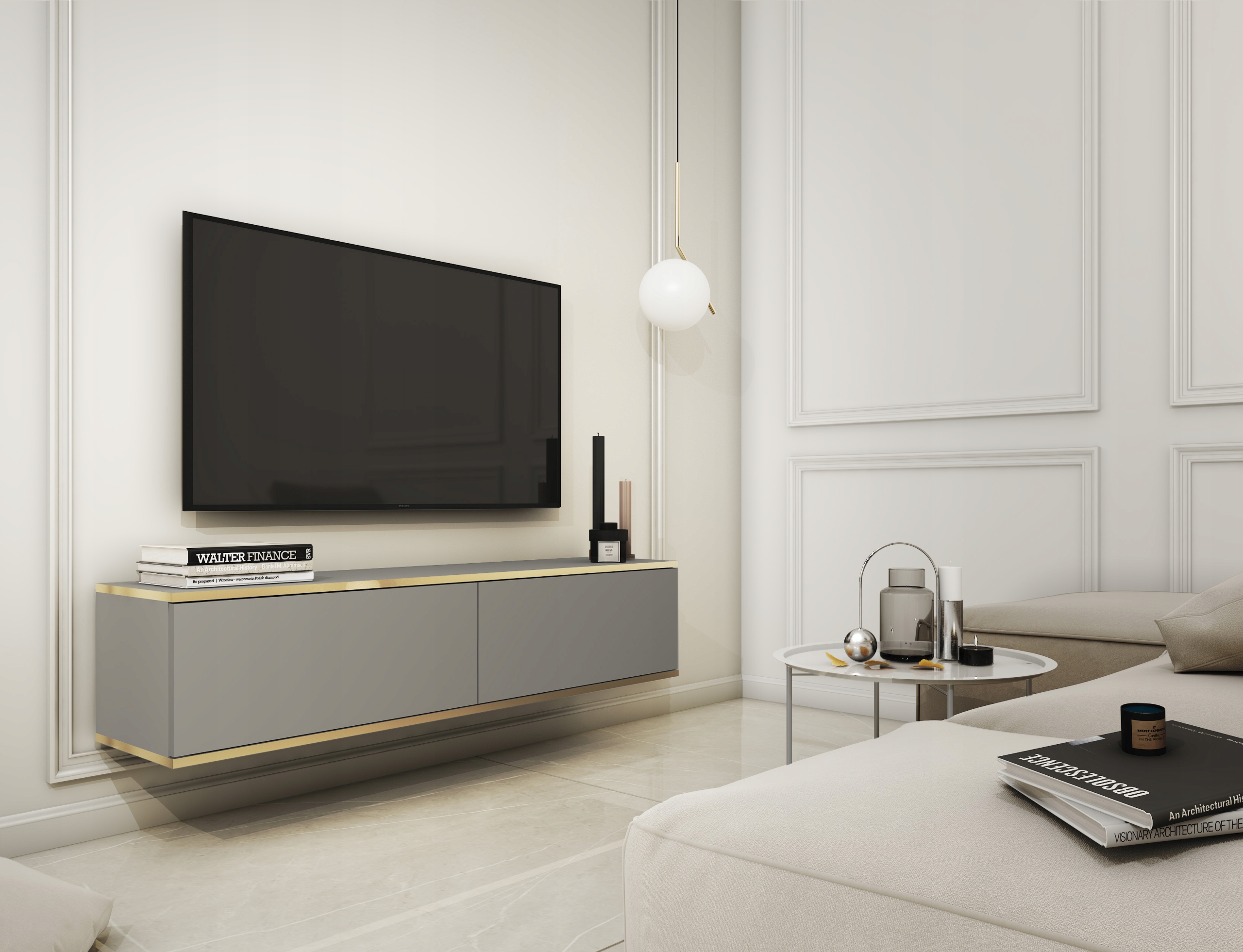 Szafka pod telewizor ORO to designerskie rozwiązanie, które łączy w sobie elegancję i funkcjonalność. Wykonana z wysokiej jakości płyty laminowanej, szafka zapewnia trwałość i estetyczny wygląd przez długie lata dzięki wykończeniu obrzeżem ABS. Kolor szary mat z subtelnym złotym wykończeniem nadaje meblowi nowoczesny i luksusowy wygląd, idealnie wpisując się w trendy współczesnych wnętrz.