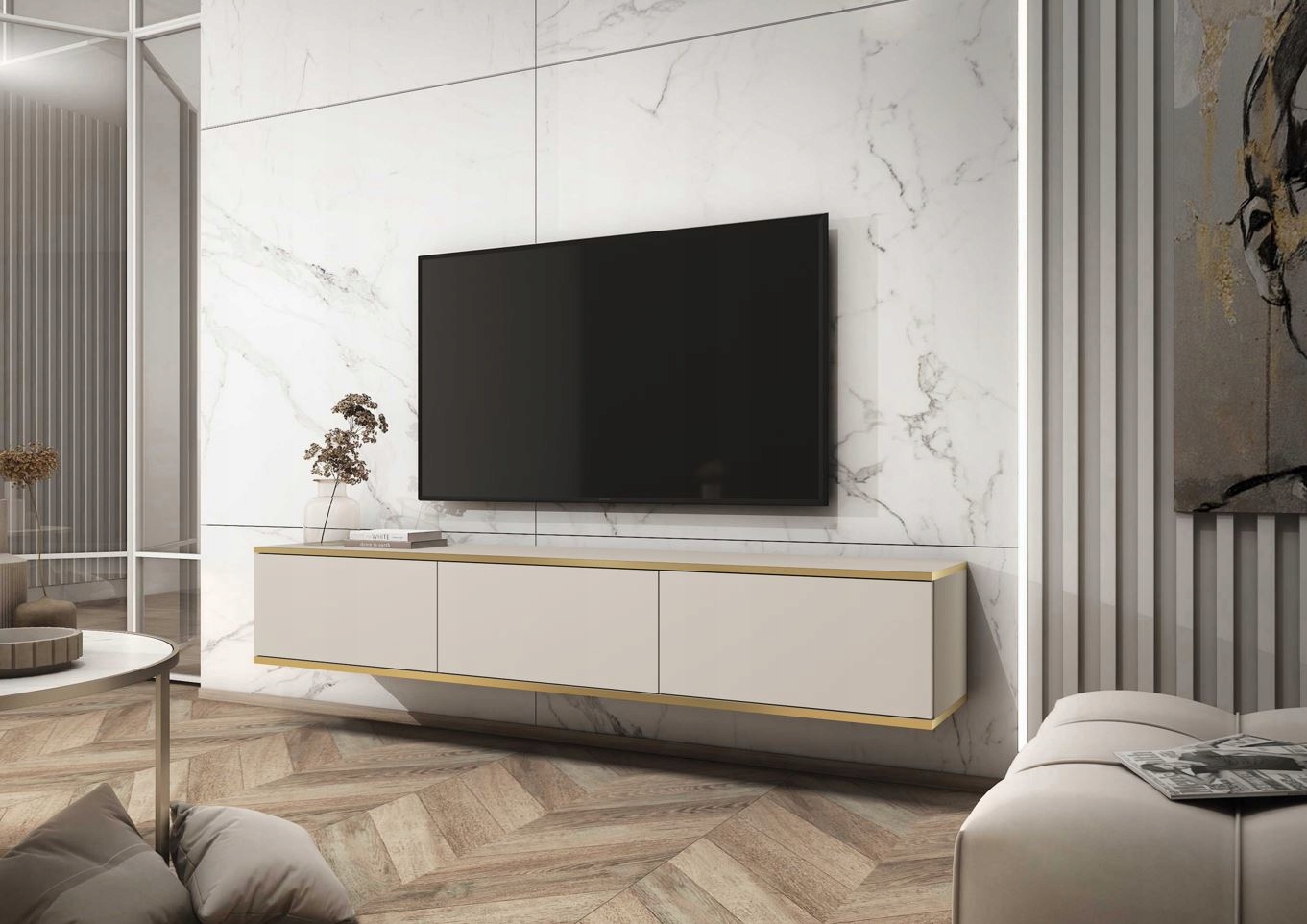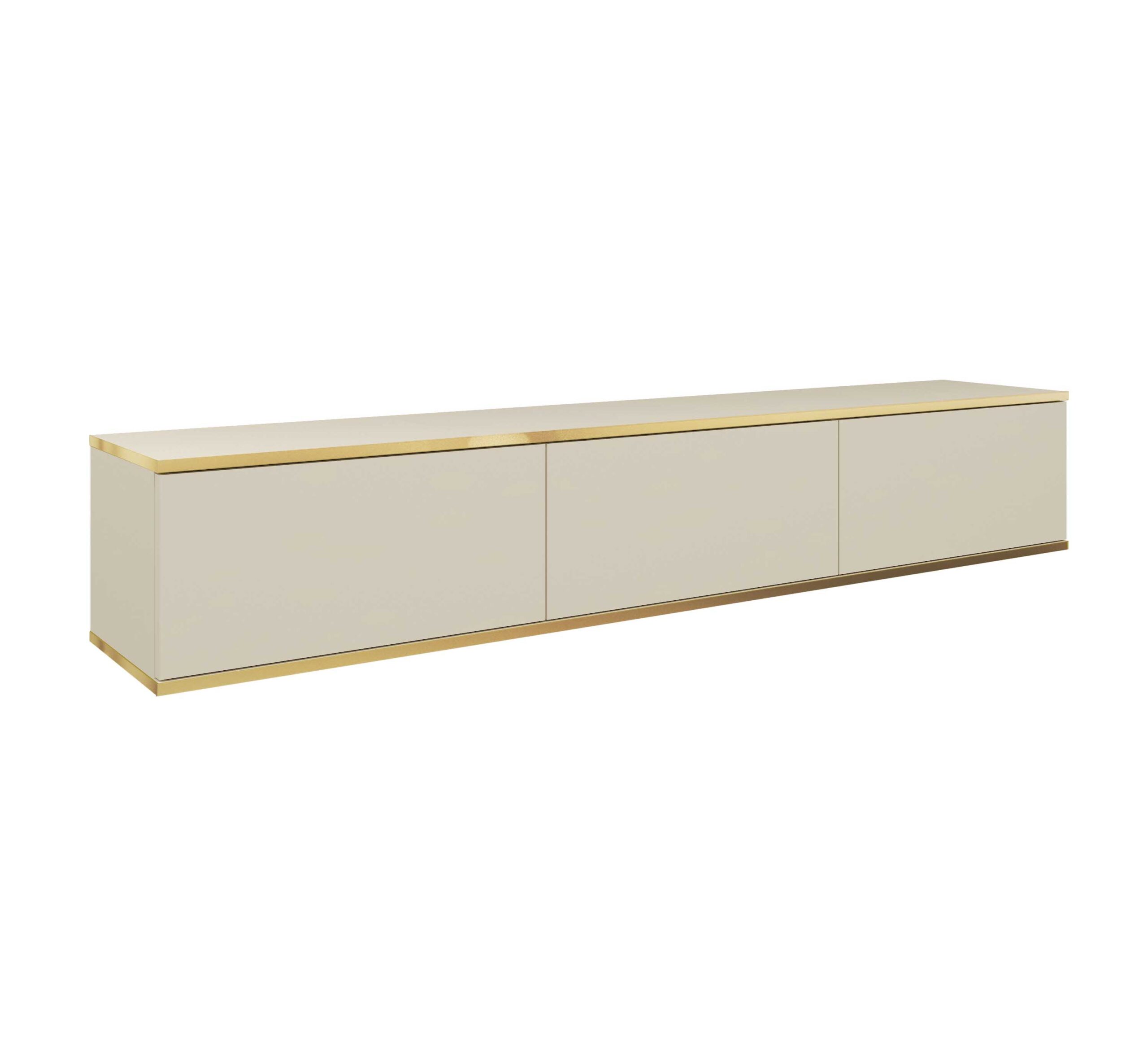 Szafka pod telewizor ORO w eleganckim beżowym kolorze z złotymi wykończeniami to idealne rozwiązanie dla osób ceniących nowoczesny design i praktyczność. Jej minimalistyczna forma doskonale wpisuje się w aktualne trendy aranżacyjne, a wiszący model nadaje wnętrzu lekkości.