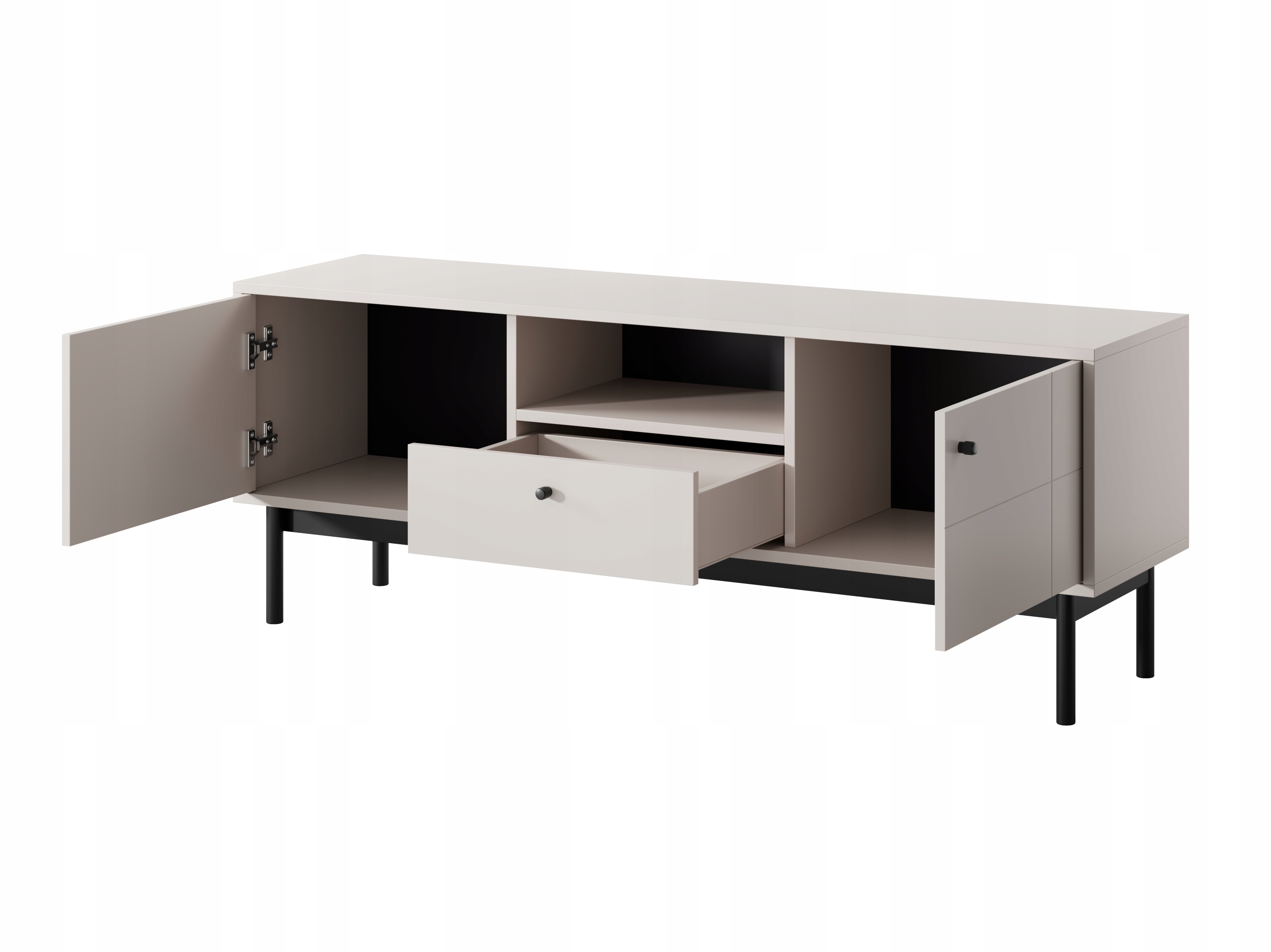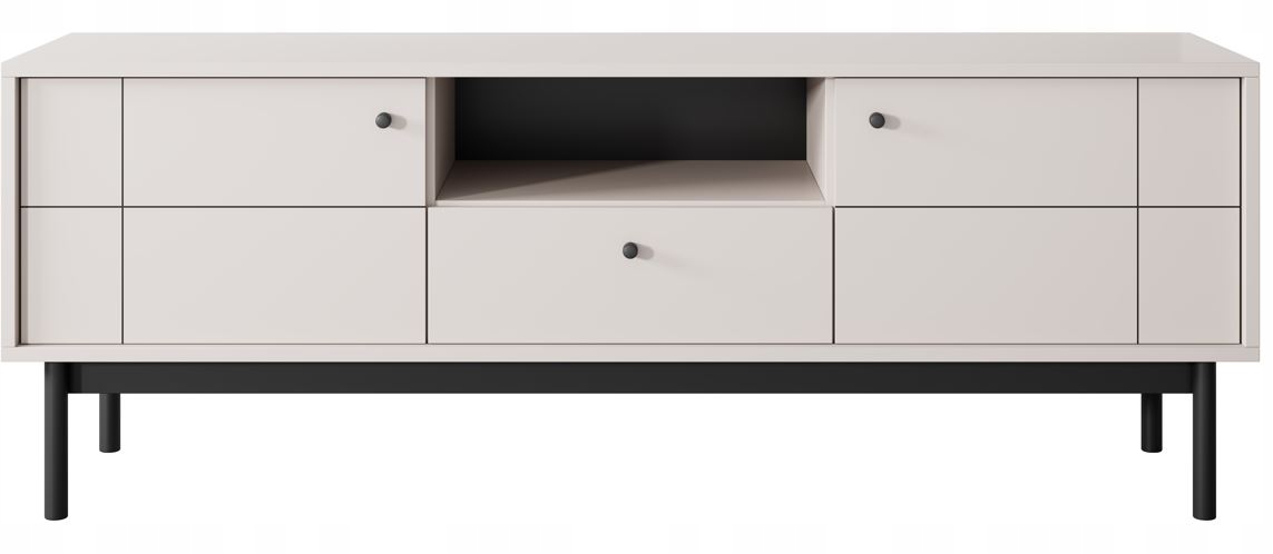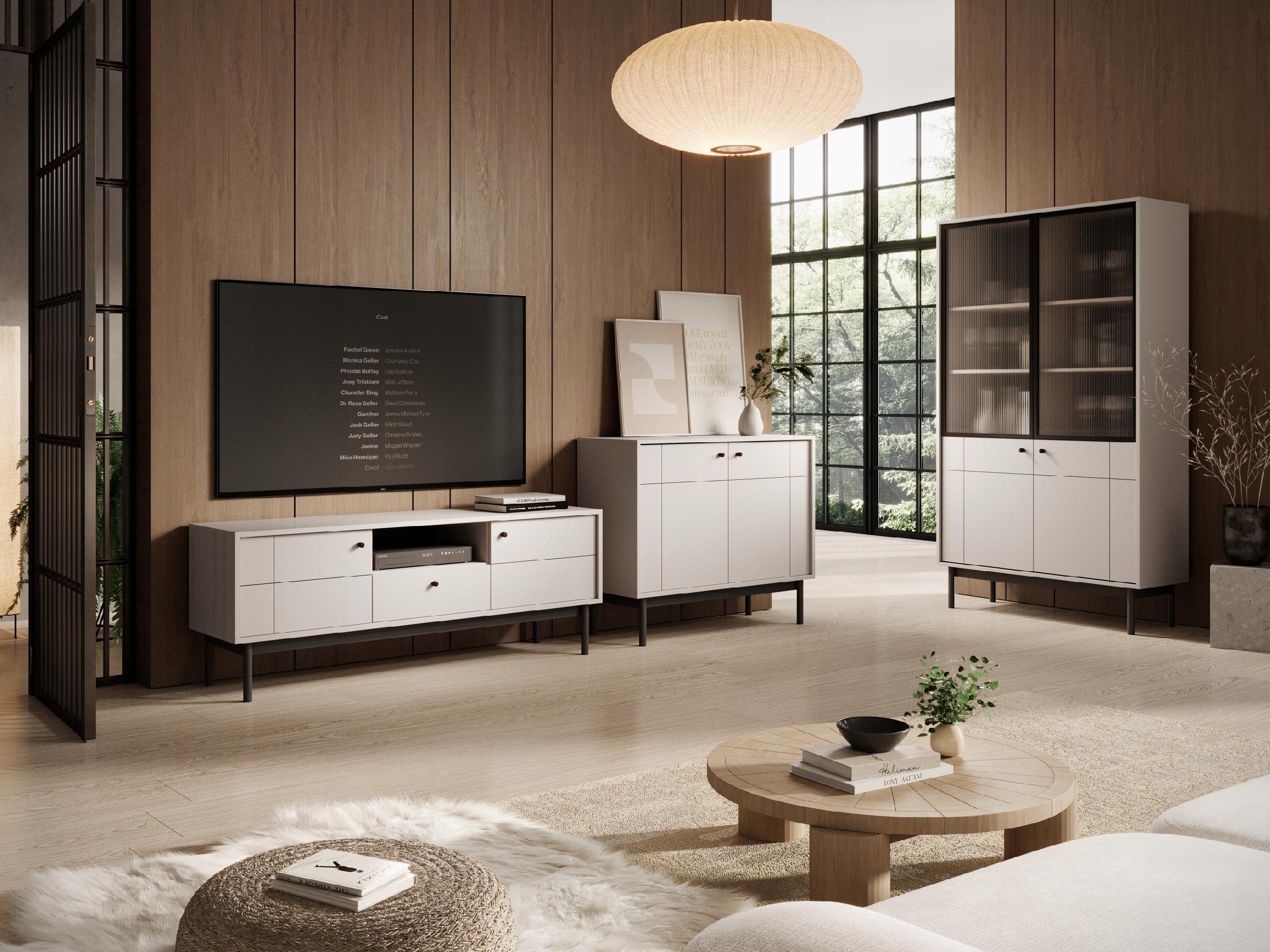 Szafka RTV JAPANDI w kolorze kaszmir to połączenie minimalizmu, funkcjonalności i elegancji, które idealnie wpisuje się w estetykę współczesnych wnętrz. Przemyślany układ z dwiema drzwiami, pojemną szufladą i otwartą półką zapewnia wygodne przechowywanie w salonie lub pokoju dziennym, utrzymując przestrzeń w pełnym porządku i stylu.