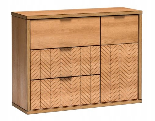 Charakterystyczne lamelowe fronty oraz hartowane szkło nadają meblowi unikalny charakter, sprawiając, że stanie się on ozdobą każdego pomieszczenia. Witryna została zaprojektowana z myślą o minimalistycznym designie, który harmonijnie wpisuje się w aktualne trendy aranżacyjne.