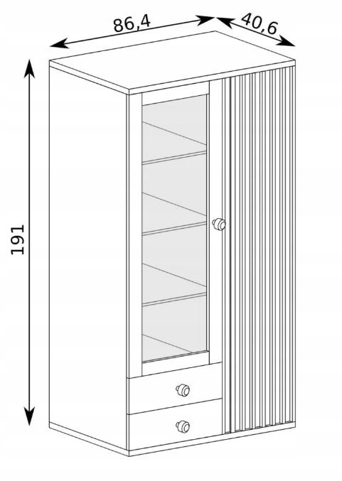 Kolekcja CAMPA zachwyca designerskim stylem i wyjątkowymi detalami, takimi jak lamelowe fronty, które nadają meblowi unikalny wygląd. Czarne uchwyty metalowe harmonijnie współgrają z całością, podkreślając minimalistyczny charakter mebla. Witryna jest wyposażona w funkcję samo domyku, co zapewnia płynne i ciche zamykanie, zwiększając komfort codziennego użytkowania.
