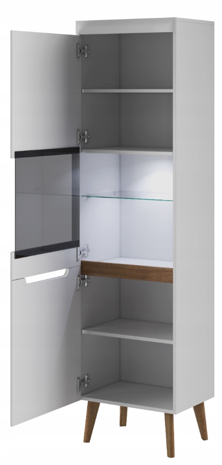 Kolekcja mebli NORDI to doskonały wybór dla osób ceniących nowoczesny design połączony z przytulnym klimatem. Białe, błyszczące fronty z płyty MDF przyciągają wzrok i pięknie odbijają światło, optycznie powiększając przestrzeń. Ciepłe wstawki w kolorze dąb Riviera dodają wnętrzu charakteru i naturalnej elegancji, tworząc harmonijną całość idealną do salonu, sypialni czy pokoju dziennego. Uwagę zwracają również wysokie, drewniane nóżki, które nadają bryłom lekkości, a przy tym ułatwiają utrzymanie porządku pod meblami – idealne rozwiązanie dla użytkowników robotów sprzątających!