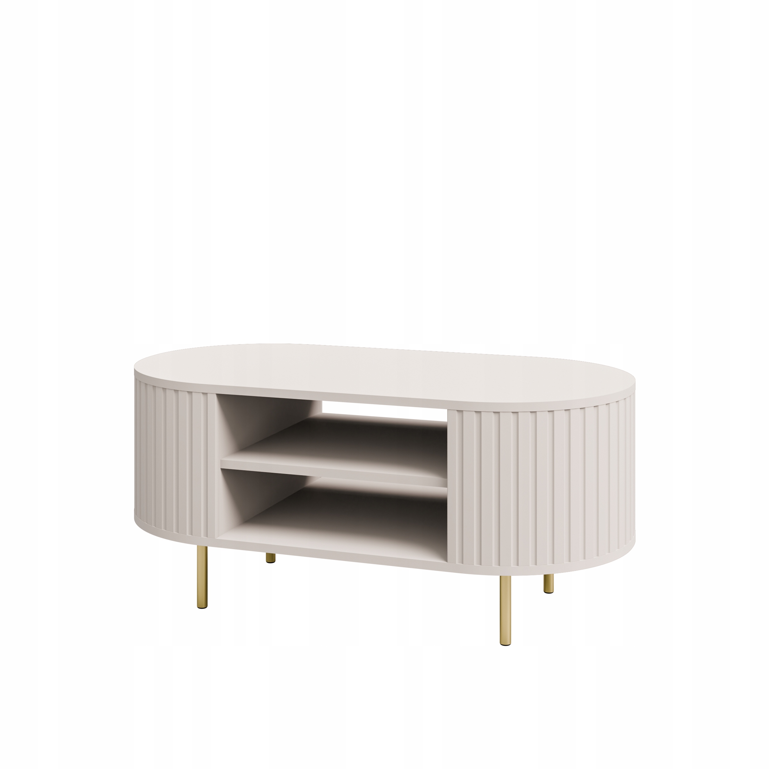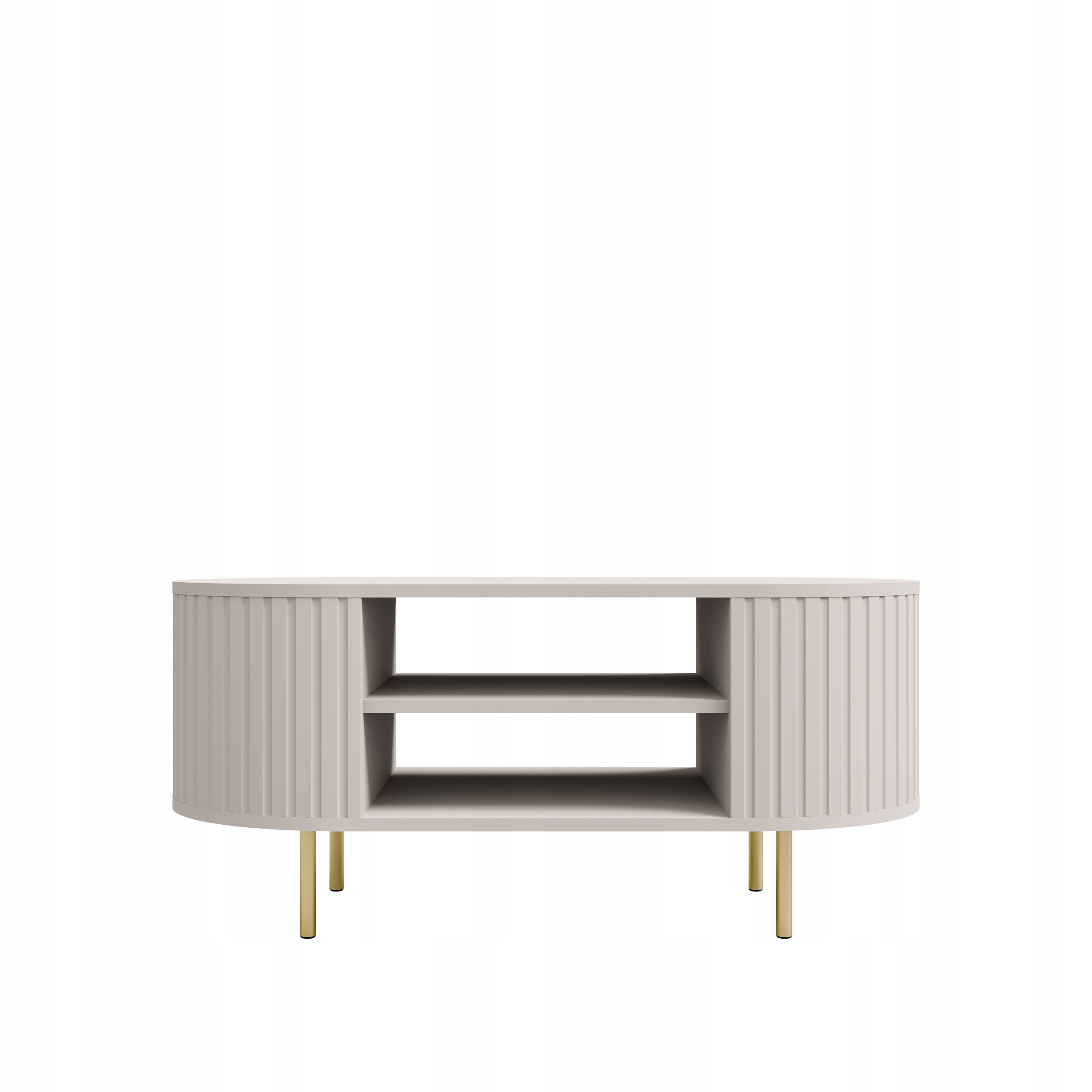 OVALIO to kolekcja mebli o minimalistycznej formie, wzbogaconej subtelnymi frezowaniami oraz delikatnie zaokrąglonymi bokami. Kolor Beż Piaskowy wprowadza do wnętrza ciepło, harmonię i elegancję, dzięki czemu mebel doskonale wpisuje się w nowoczesne oraz minimalistyczne aranżacje salonu. Złote metalowe nogi podkreślają elegancki charakter bryły i nadają jej wizualnej lekkości.