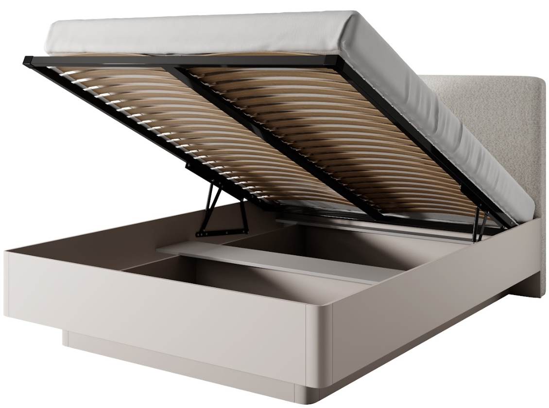 Łóżko z kolekcji LANTE to połączenie elegancji, komfortu i funkcjonalności w nowoczesnym wydaniu. Beżowa kolorystyka wprowadza do wnętrza przytulność i harmonię, a złote, walcowate nóżki nadają całości lekkości i szyku w stylu glamour. Charakterystyczne zaoblone krawędzie oraz frezowane detale w korpusie podkreślają wyjątkowy charakter bryły, która wyróżnia się na tle klasycznych łóżek. Tapicerowane wezgłowie wykonane z miękkiej tkaniny i wypełnione pianką zapewnia wygodne oparcie podczas wieczornego relaksu. Łóżko oferuje praktyczny pojemnik na pościel, który pomieści kołdry, poduszki i inne tekstylia, a solidny metalowy stelaż z podnośnikiem gazowym ułatwia codzienne użytkowanie. Korpus wykonano z trwałej płyty laminowanej, listwy ozdobne z MDF, a obrzeża zabezpieczono okleiną ABS. Stabilne nogi i złote uchwyty zostały wykonane z metalu, co zapewnia trwałość i estetyczne wykończenie. Powierzchnia spania wynosi 160 x 200 cm, a materac należy dobrać osobno. Mebel został wyprodukowany w Polsce i przeznaczony jest do samodzielnego montażu.