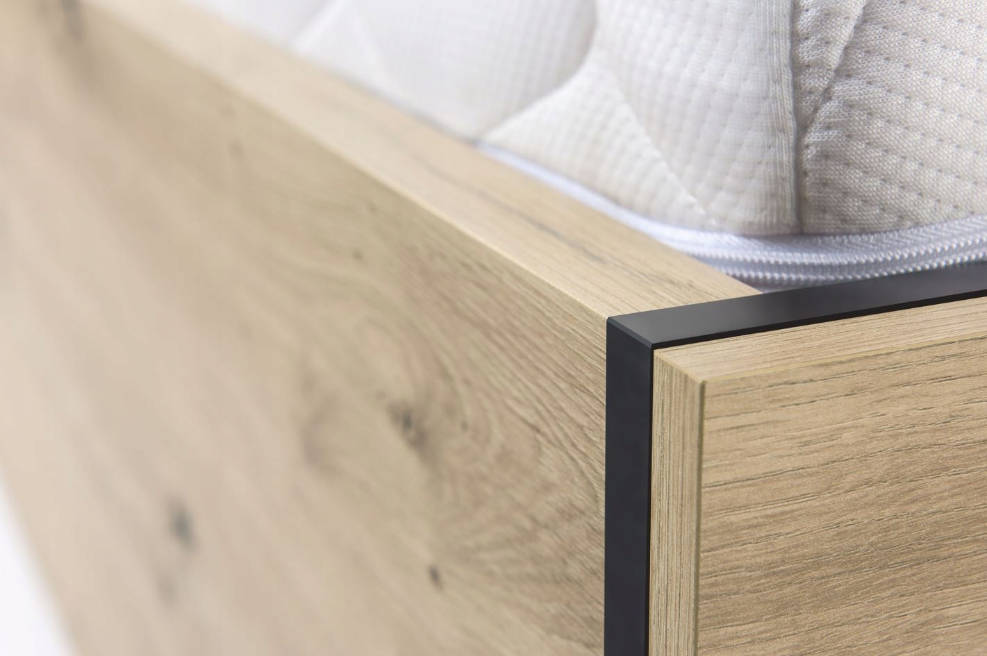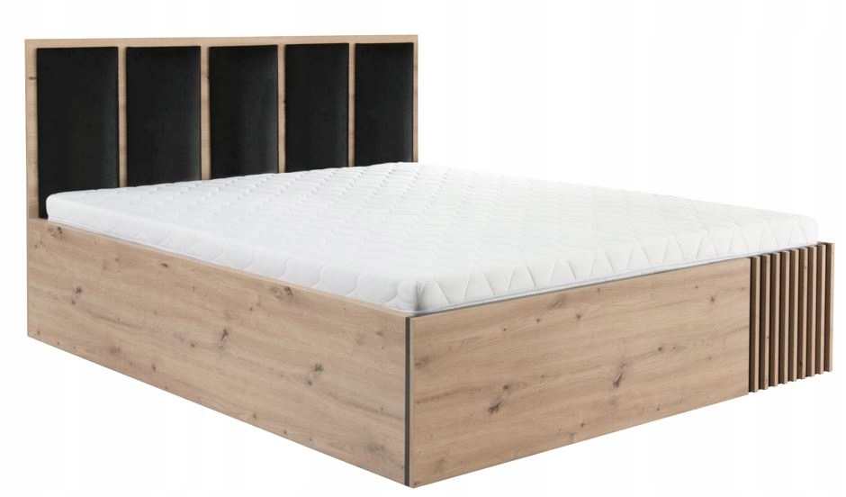 Łóżko CAMPA to połączenie elegancji, funkcjonalności i komfortu, które nada Twojej sypialni wyjątkowy urok. Tapicerowane panele zagłówka w kolorze czarnym oraz rama w odcieniu dąb artisan podkreślają naturalny styl i przytulność, tworząc harmonijną przestrzeń do wypoczynku.