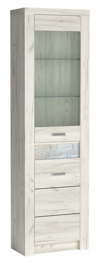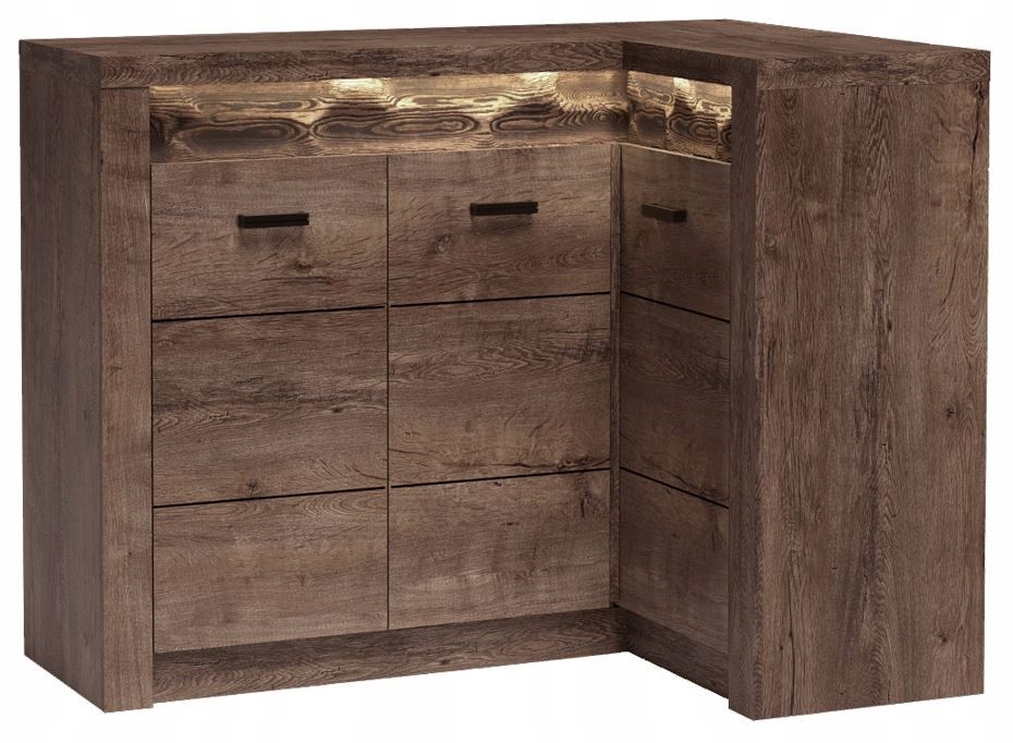 Dzięki opcjonalnemu oświetleniu możesz podkreślić detale drewnianej wstawki, tworząc przyjemną atmosferę w pomieszczeniu. Funkcjonalność pojemnika jest niezrównana – szuflady z pełnym wysuwem zapewniają łatwy dostęp do przechowywanych przedmiotów, a metalowe uchwyty dodają nowoczesnego wyrazu.