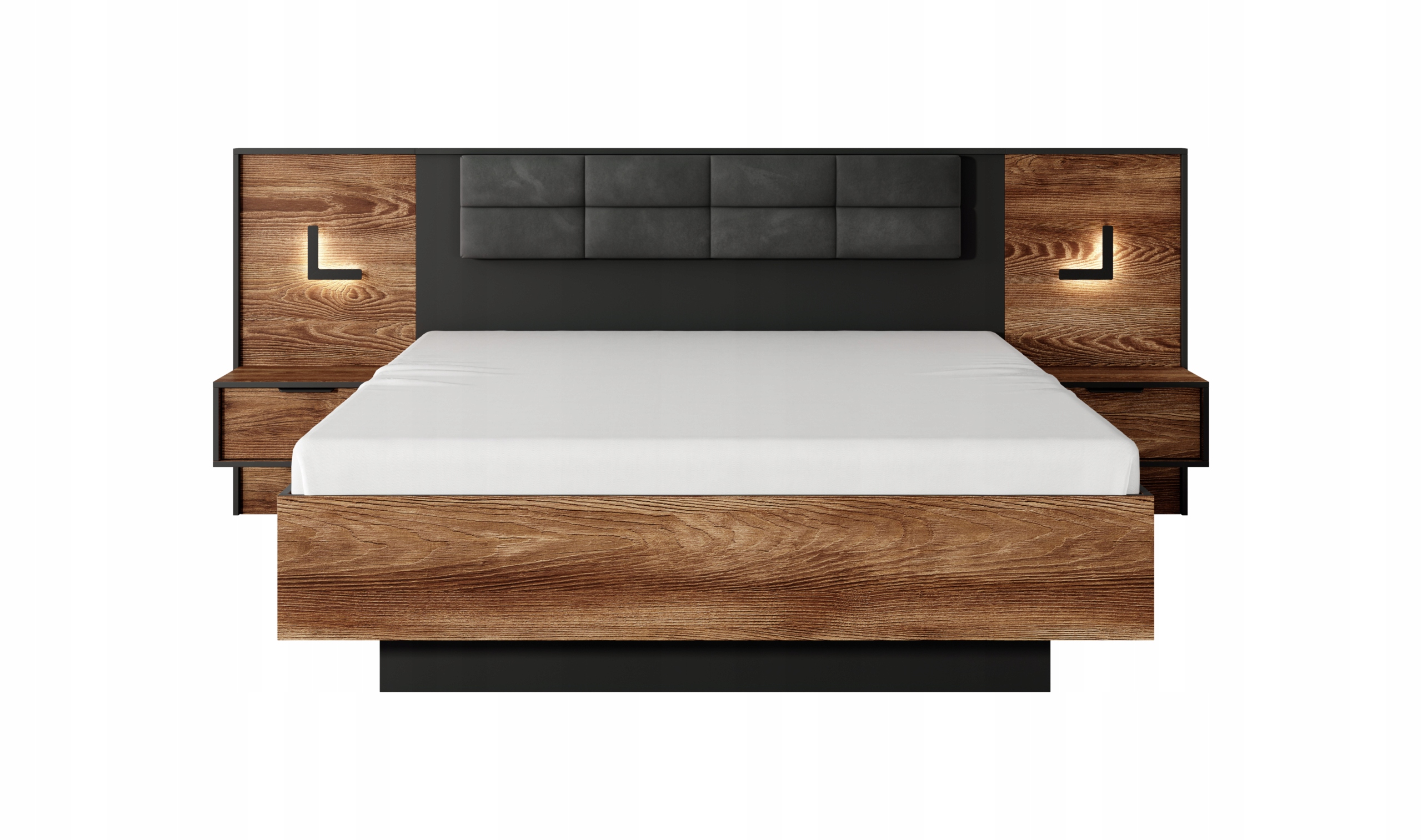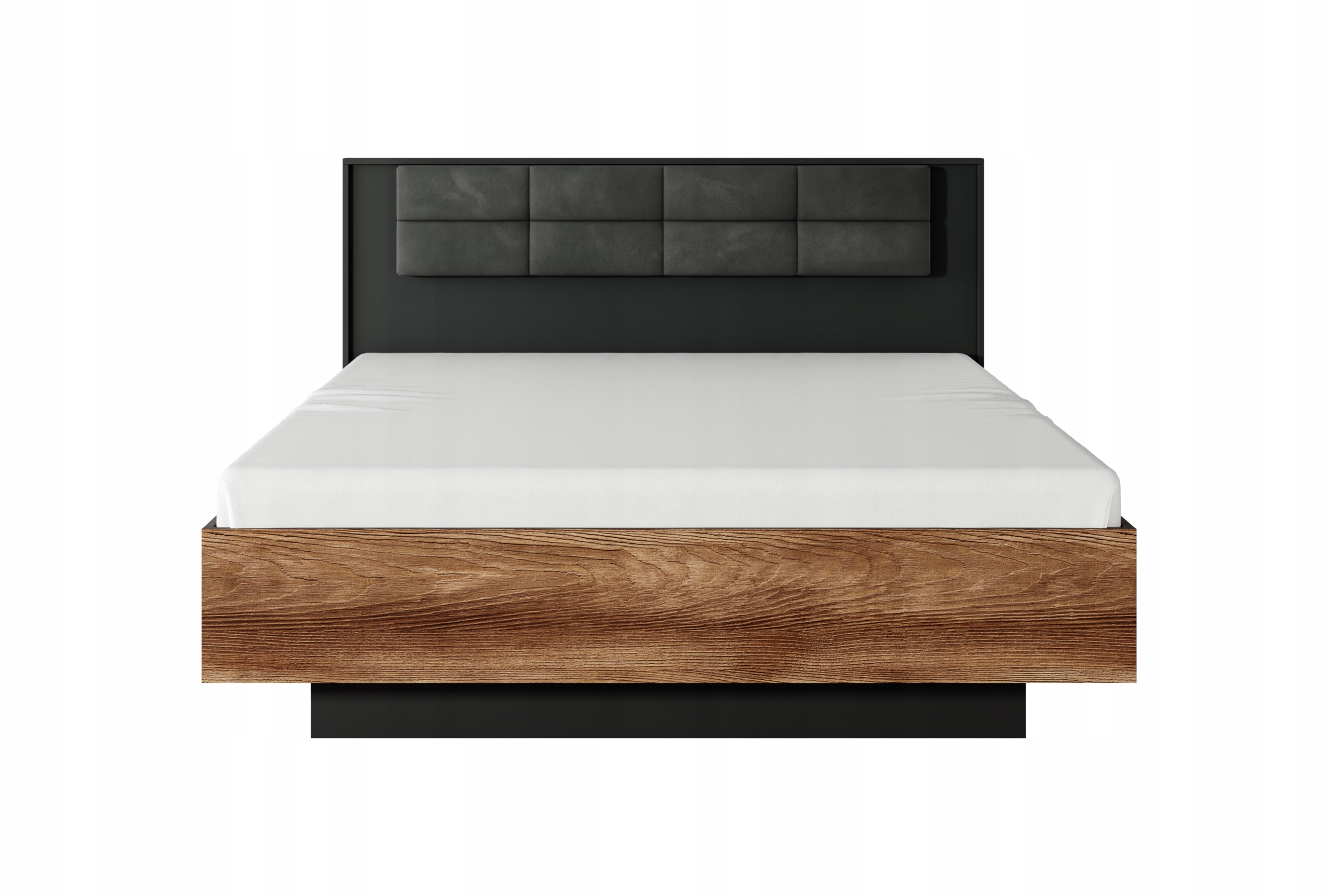 Model ten wyróżnia się tapicerowanym zagłówkiem w odcieniu grafitu, który nadaje sypialni nowoczesnego charakteru i przytulności. Kontrastująca skrzynia w kolorze kasztanu oraz wstawki w antracycie podkreślają elegancki styl mebla, doskonale współgrając z industrialnymi metalowymi uchwytami i czarnymi nóżkami.