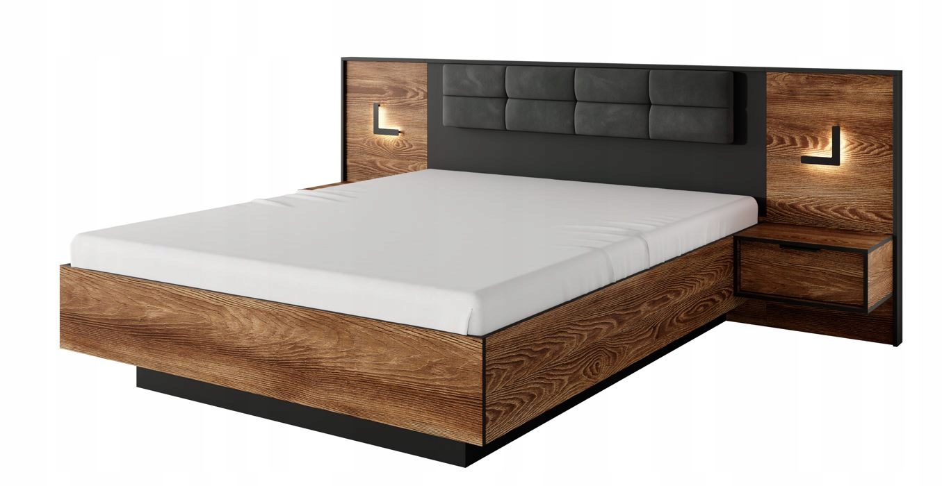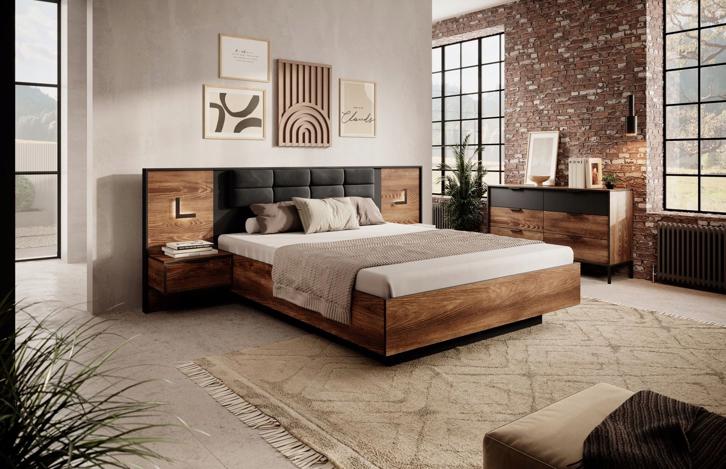 Zestaw sypialniany MILTON to perfekcyjne rozwiązanie dla osób ceniących komfort, nowoczesny design i funkcjonalność. Centralnym elementem zestawu jest łóżko o powierzchni spania 160×200 cm z pojemnikiem oraz podnoszonym stelażem, które zapewniają dodatkową przestrzeń na przechowywanie pościeli, poduszek i innych akcesoriów, ułatwiając utrzymanie porządku. Elegancki tapicerowany zagłówek w grafitowym odcieniu nadaje sypialni stylowego charakteru, a kasztanowy korpus łóżka doskonale kontrastuje z antracytowymi wstawkami, tworząc harmonijną i przytulną atmosferę.