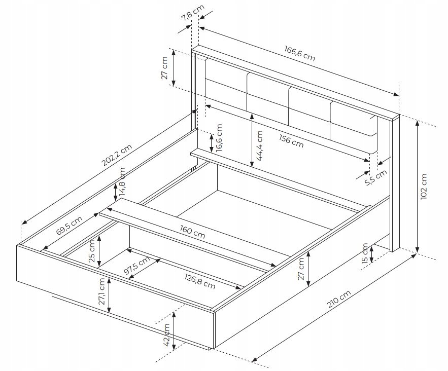 – Łóżko o powierzchni spania 160×200 cm z pojemnikiem i stelażem podnoszonym