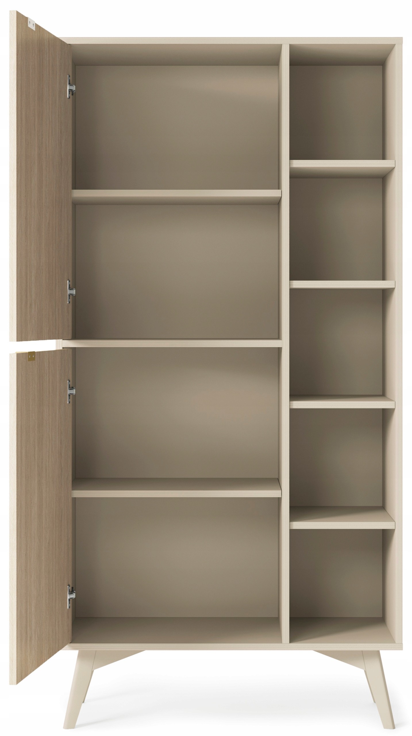 Wysoki, pojemny regał z kolekcji GRANNA to mebel, który doskonale sprawdzi się w salonie, sypialni, czy jadalni. Jego imponująca wysokość oraz praktyczne półki sprawiają, że regał oferuje dużo miejsca do przechowywania, a jednocześnie stanowi elegancki element dekoracyjny. Fronty z subtelnym wzorem jodełki oraz korpus w kolorze beż piaskowy tworzą harmonijną całość, wprowadzając spokój i wyrafinowanie do każdego pomieszczenia.