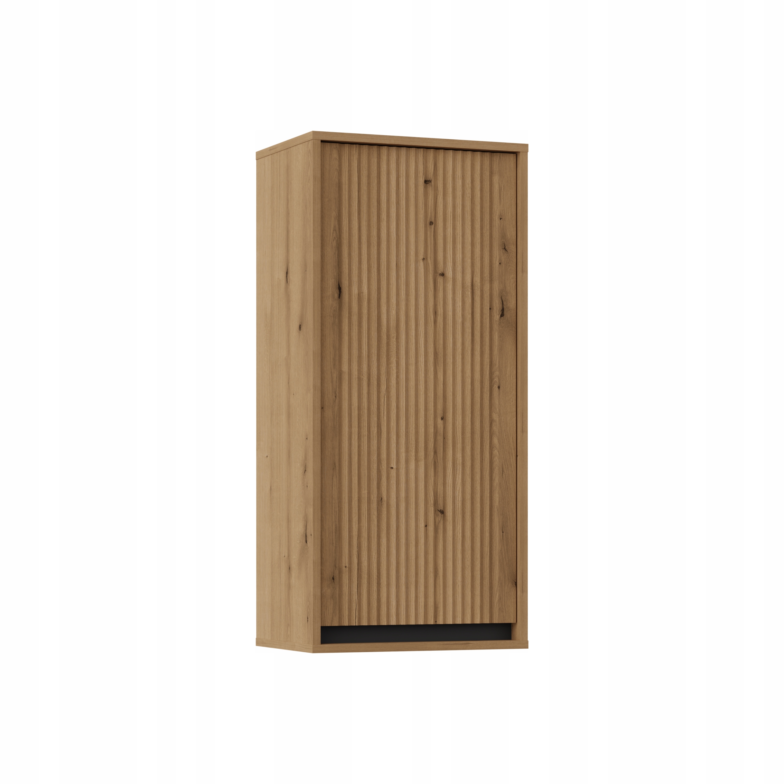 Wykonana w eleganckim kolorze dąb evoke z charakterystycznymi frezowanymi frontami, szafka wprowadza do wnętrza subtelny akcent inspirowany japońską estetyką. Elementy w kolorze czarnego matu dodają jej współczesnego charakteru, a czarne metalowe nogi nadają meblowi lekkości i nowoczesności. Otwieranie drzwiczek za pomocą podchwytu oraz zabezpieczone obrzeża ABS zapewniają zarówno wygodę użytkowania, jak i trwałość na lata.