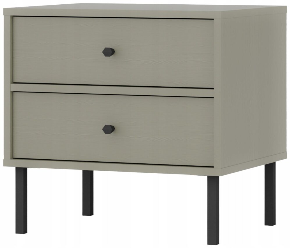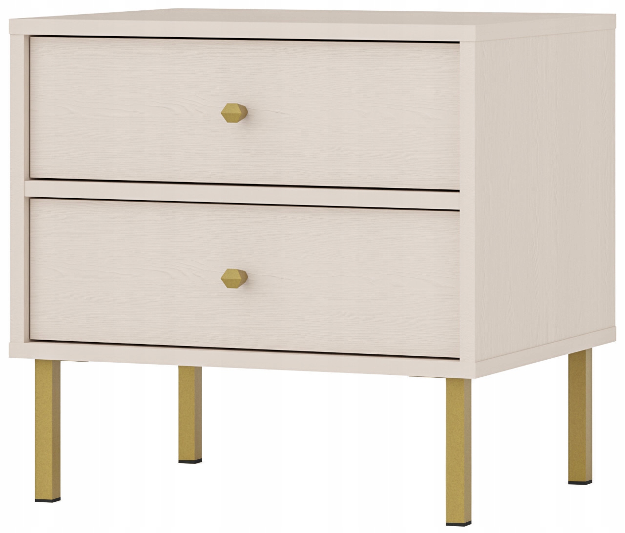 Szafka nocna z kolekcji AVILA łączy w sobie elegancję i funkcjonalność, idealnie sprawdzając się w każdej sypialni. Wyposażona w dwie szuflady zapewnia wygodną przestrzeń na przechowywanie najpotrzebniejszych przedmiotów, takich jak książki, telefon czy lampka nocna. Beż piaskowy korpusu i frontów w połączeniu ze złotymi metalowymi nóżkami i uchwytami nadaje temu stolikowi nocnemu wyjątkowy wygląd, który doda blasku każdemu wnętrzu.