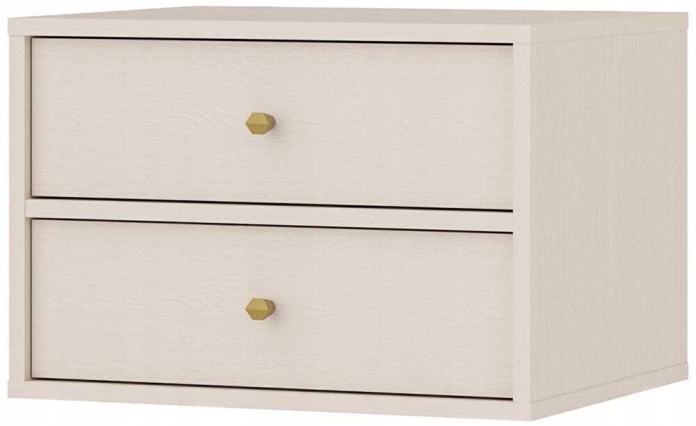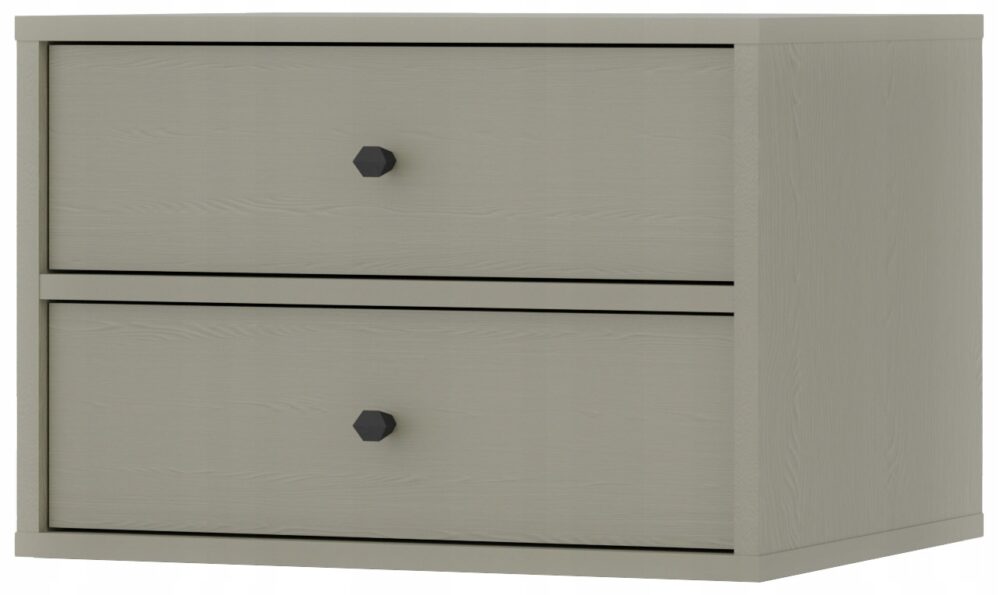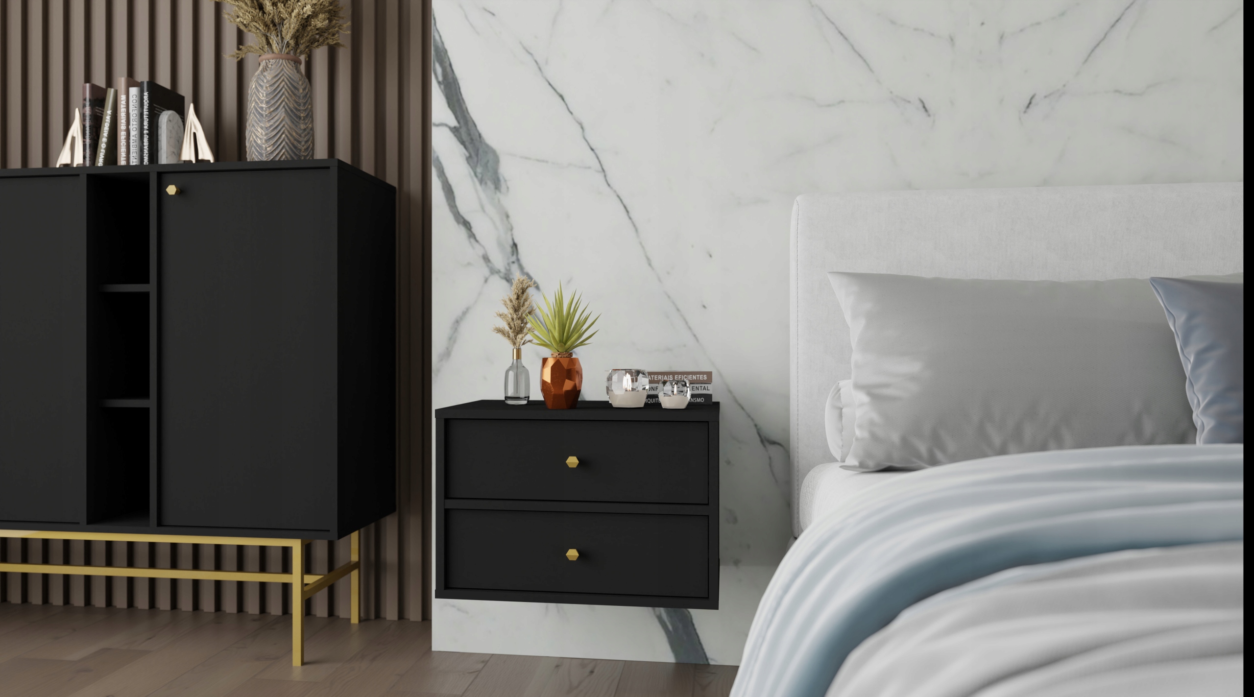 Wisząca szafka nocna AVILA to eleganckie rozwiązanie dla tych, którzy cenią nowoczesny styl i wygodę. Dzięki konstrukcji do montażu na ścianie, szafka unosi się nad podłogą, nadając wnętrzu lekkości oraz łatwości w utrzymaniu czystości. Dwie przestronne szuflady oferują wystarczająco miejsca na najpotrzebniejsze drobiazgi – idealne na książki, ładowarki czy inne akcesoria, które chcesz mieć pod ręką.