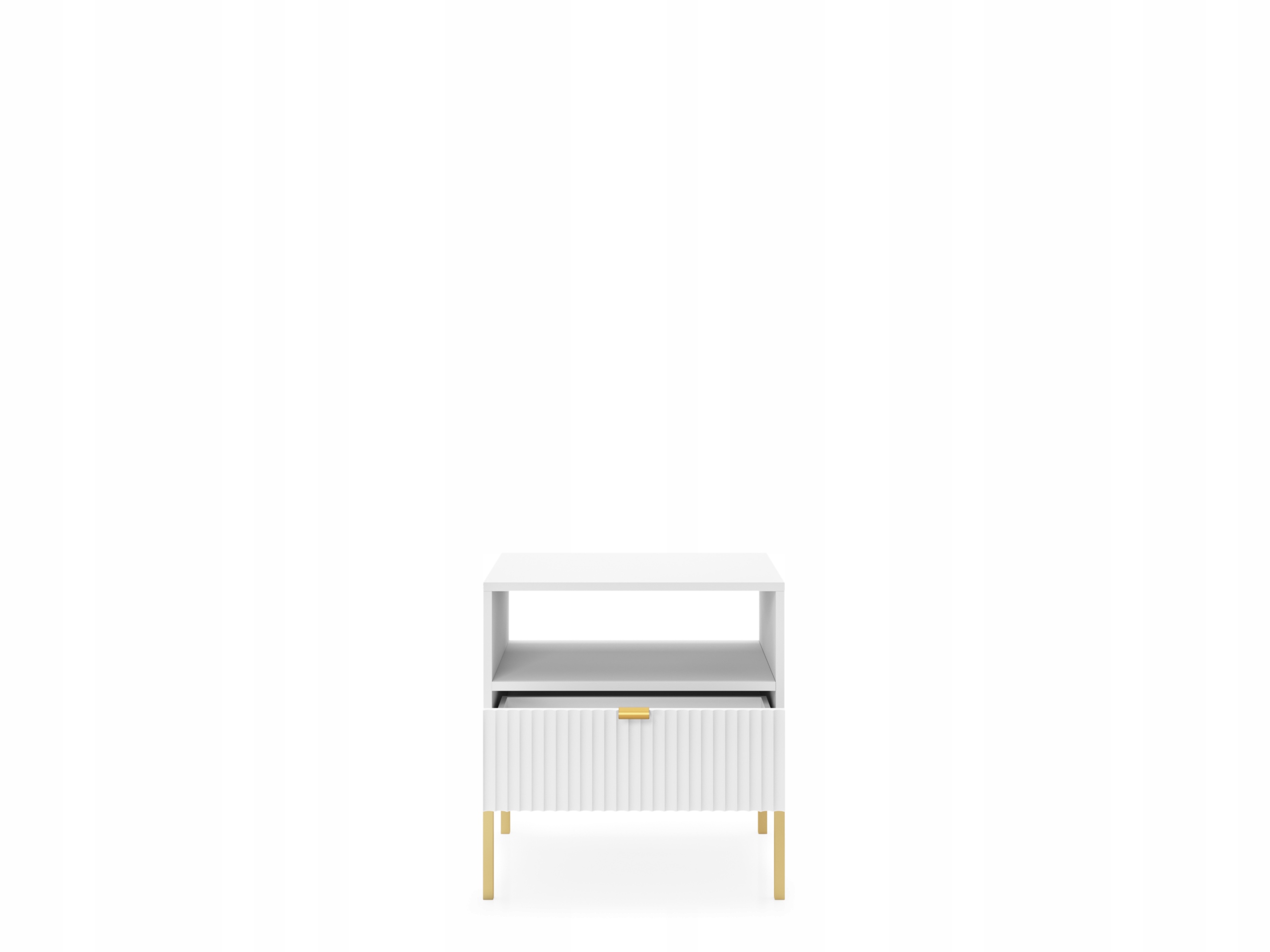 Szafka nocna BELLAZA to elegancka i funkcjonalna propozycja do sypialni, która łączy nowoczesny styl z wyjątkową praktycznością. Jej frezowane fronty oraz złote, metalowe nóżki nadają meblowi luksusowego charakteru, idealnie wpisując się w różne aranżacje wnętrz, zarówno minimalistyczne, jak i bardziej klasyczne.