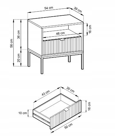 Dzięki dwóm pojemnym szufladom, stolik nocny zapewnia wygodne miejsce na przechowywanie najpotrzebniejszych rzeczy, takich jak książki, ładowarki czy inne drobne akcesoria. Frezowane fronty dodają meblowi głębi i trójwymiarowego wyglądu, co podkreśla jego wyjątkowy design. Metalowe nóżki, malowane na złoto, nie tylko stabilizują nakastlik, ale także ułatwiają sprzątanie pod meblem, umożliwiając swobodny dostęp dla odkurzaczy automatycznych.