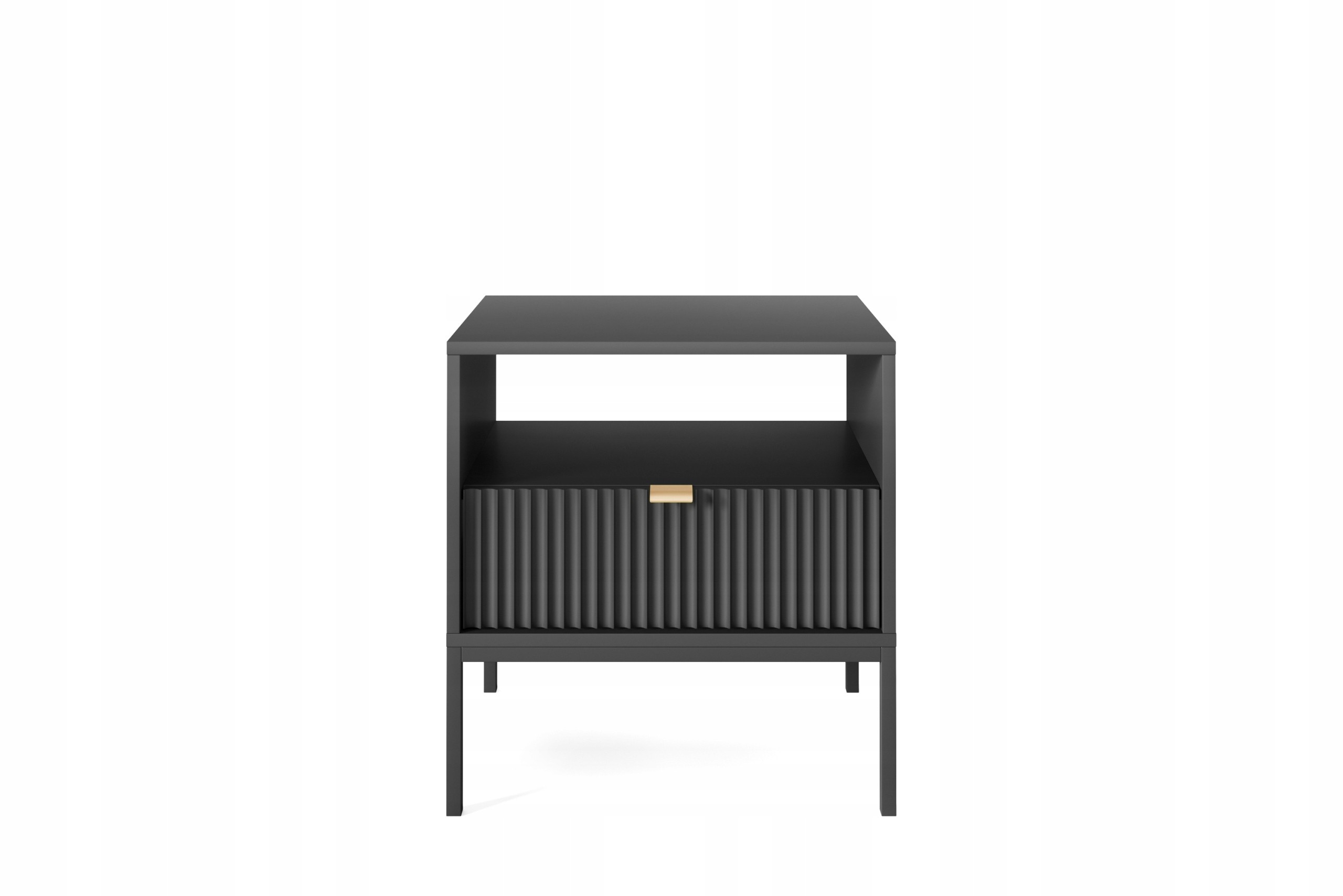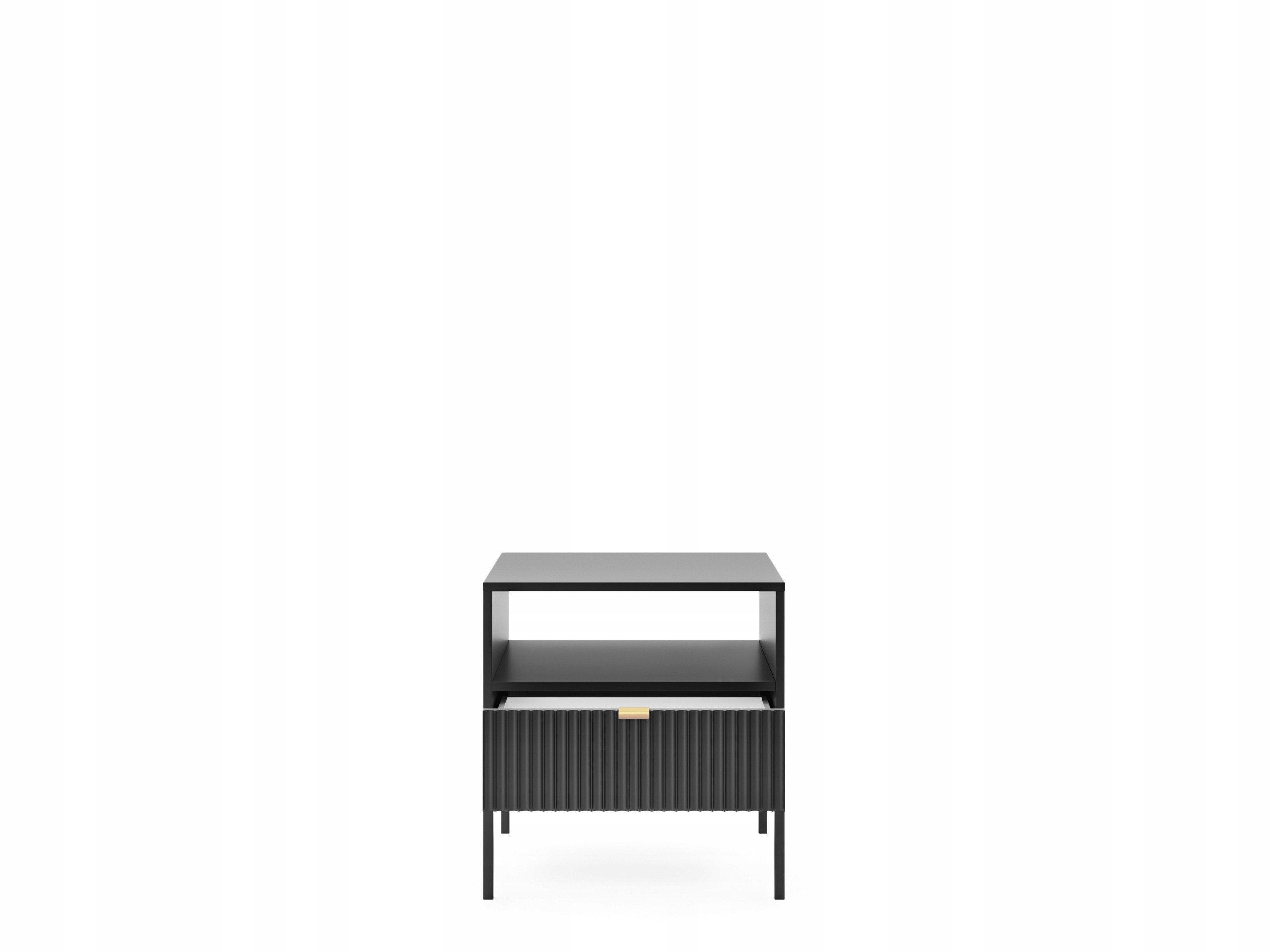 Szafka nocna BELLAZA to doskonałe połączenie elegancji i funkcjonalności, które wprowadzi do Twojej sypialni wyjątkowy klimat. Charakteryzuje się ryflowanymi frontami, które dodają jej nowoczesnego i stylowego wyglądu. Złoty uchwyt to elegancki akcent, który pięknie kontrastuje z czarnym wykończeniem, nadając szafce luksusowego charakteru.