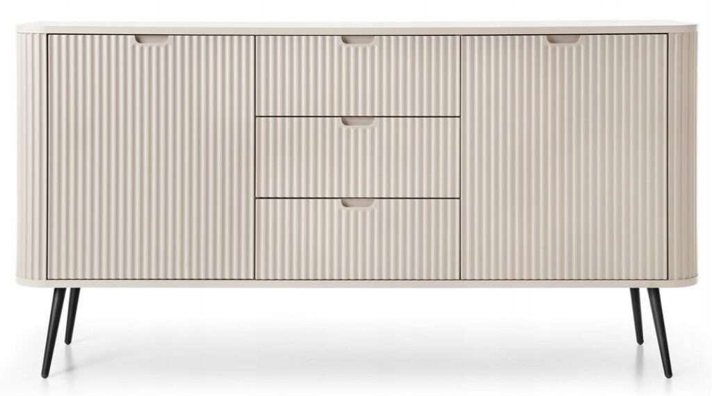 Szafka nocna BELLAZA to idealne połączenie elegancji i funkcjonalności, doskonale wpisujące się w nowoczesne wnętrza. Jej czarne matowe fronty z ryflowanymi zdobieniami nadają meblowi wyjątkowy charakter, podkreślając jego luksusowy styl. Złote uchwyty i metalowe nóżki o wysokości 14 cm tworzą harmonijną kompozycję, która wprowadza do wnętrza odrobinę designerskiego blasku.