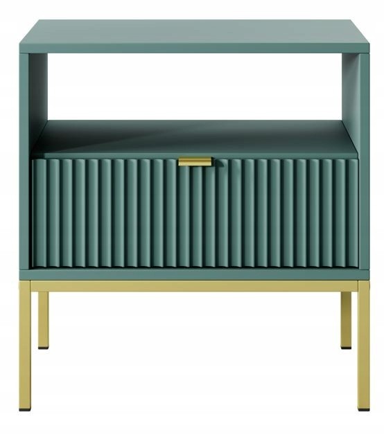 Szafka nocna BELLAZA łączy nowoczesny design z wyrafinowaną elegancją, tworząc wyjątkowy element każdej sypialni. Zielona szafka z ryflowanymi frontami i subtelnymi czarnymi metalowymi nóżkami nadaje wnętrzu luksusowy, a jednocześnie nowoczesny charakter. Dzięki przemyślanemu projektowi, szafka nie tylko pięknie się prezentuje, ale także oferuje praktyczną przestrzeń do przechowywania. Idealna do wnętrz urządzonych w stylu nowoczesnym lub loftowym. Odkryj całą kolekcję BELLAZA i stwórz harmonijną aranżację swojego domu!