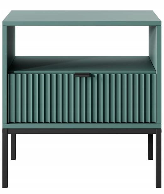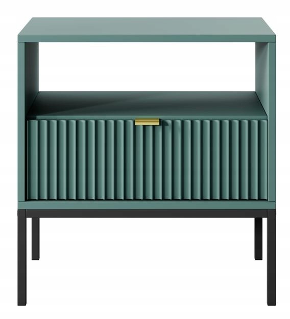 Zielona Szafka Nocna BELLAZA to prawdziwa perła wśród nowoczesnych mebli. Jej ryflowane fronty w głębokim odcieniu labrador nadają jej wyjątkowego charakteru, a złote nóżki i uchwyty wprowadzają subtelny akcent luksusu. Stolik, poza estetycznym wyglądem, zapewnia funkcjonalność, oferując miejsce na codzienne drobiazgi, a jego wykończenie gwarantuje trwałość i odporność.
