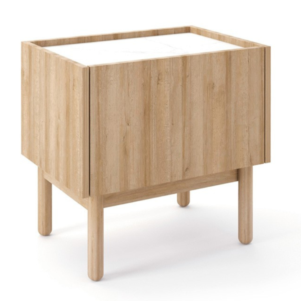 Stolik nocny stoi na drewnianych nóżkach, co zapewnia stabilność i lekkość całej konstrukcji, a także ułatwia utrzymanie czystości w sypialni. Dzięki minimalistycznemu designowi inspirowanemu skandynawskim stylem, nakastlik idealnie wpasuje się w nowoczesne wnętrza, wprowadzając harmonię i spokój.