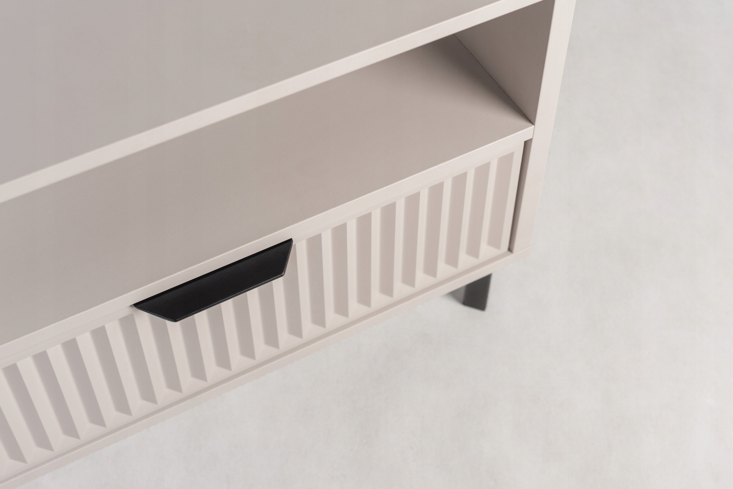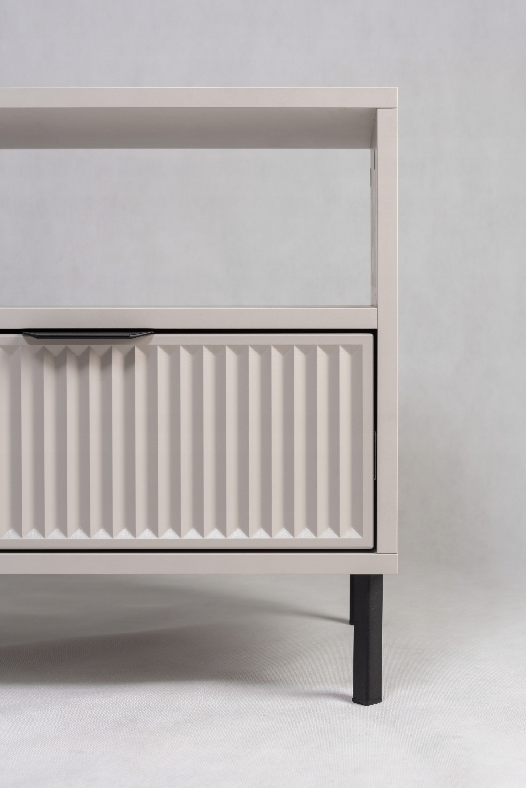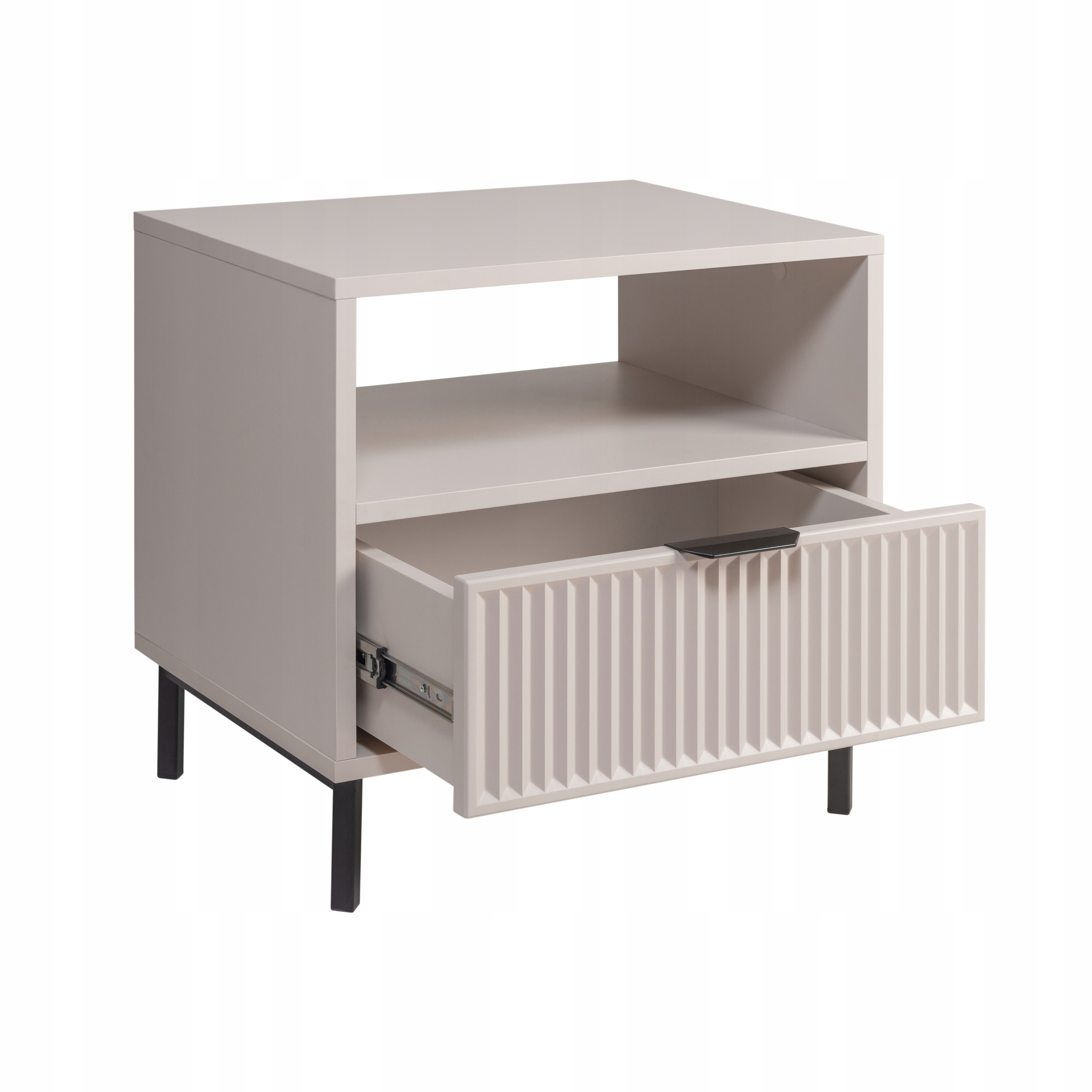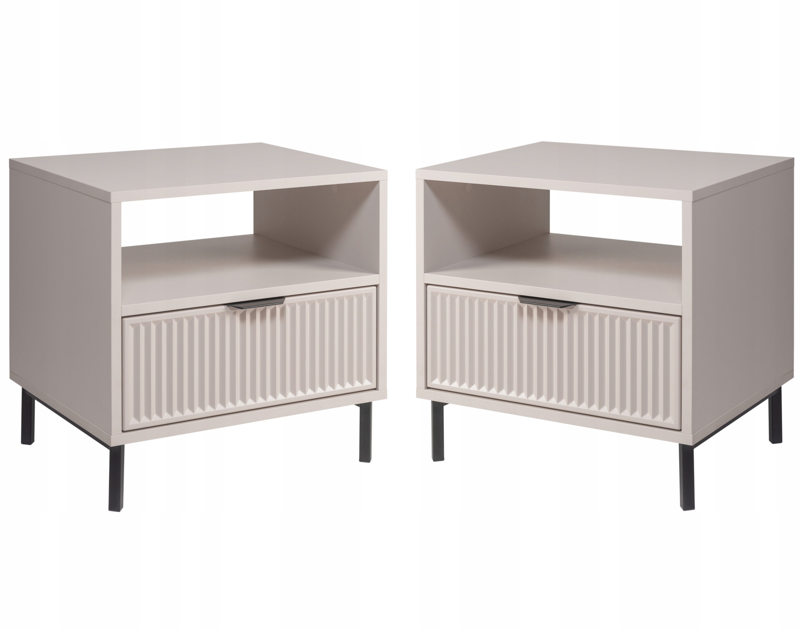 Zestaw 2 szafek nocnych KASZMIROWA to idealne uzupełnienie każdej sypialni. Stylowe, funkcjonalne i nowoczesne, doskonale pasują do mebli sypialnianych w różnych aranżacjach. Ich ryflowana szuflada oferuje dyskretną przestrzeń na drobiazgi, a otwarta półka to idealne miejsce na książki, budzik czy inne przedmioty, które chcesz mieć pod ręką. Czarne metalowe nogi dodają nowoczesnego charakteru, a subtelny kolor kaszmir wprowadza do wnętrza elegancję i harmonię. To doskonały wybór dla tych, którzy szukają mebli do sypialni łączących styl i funkcjonalność.