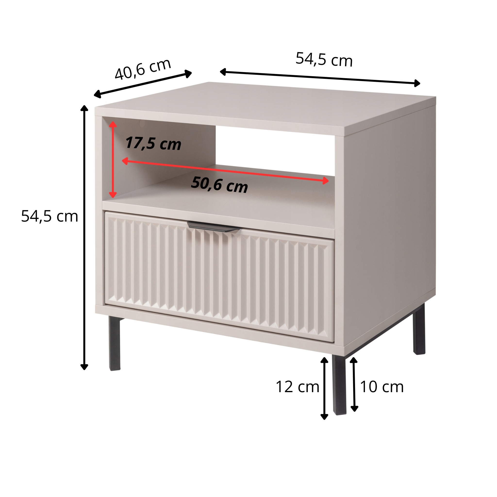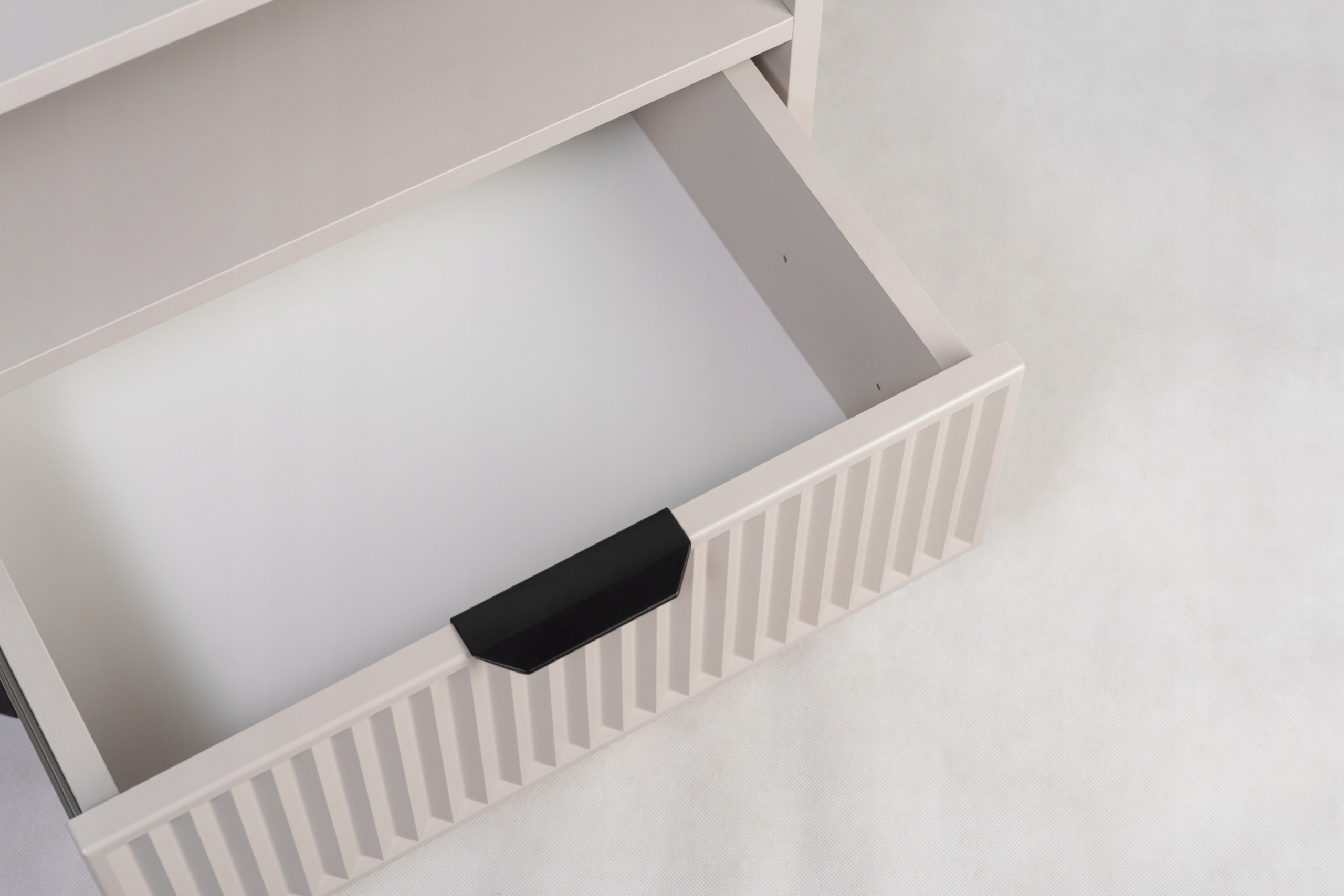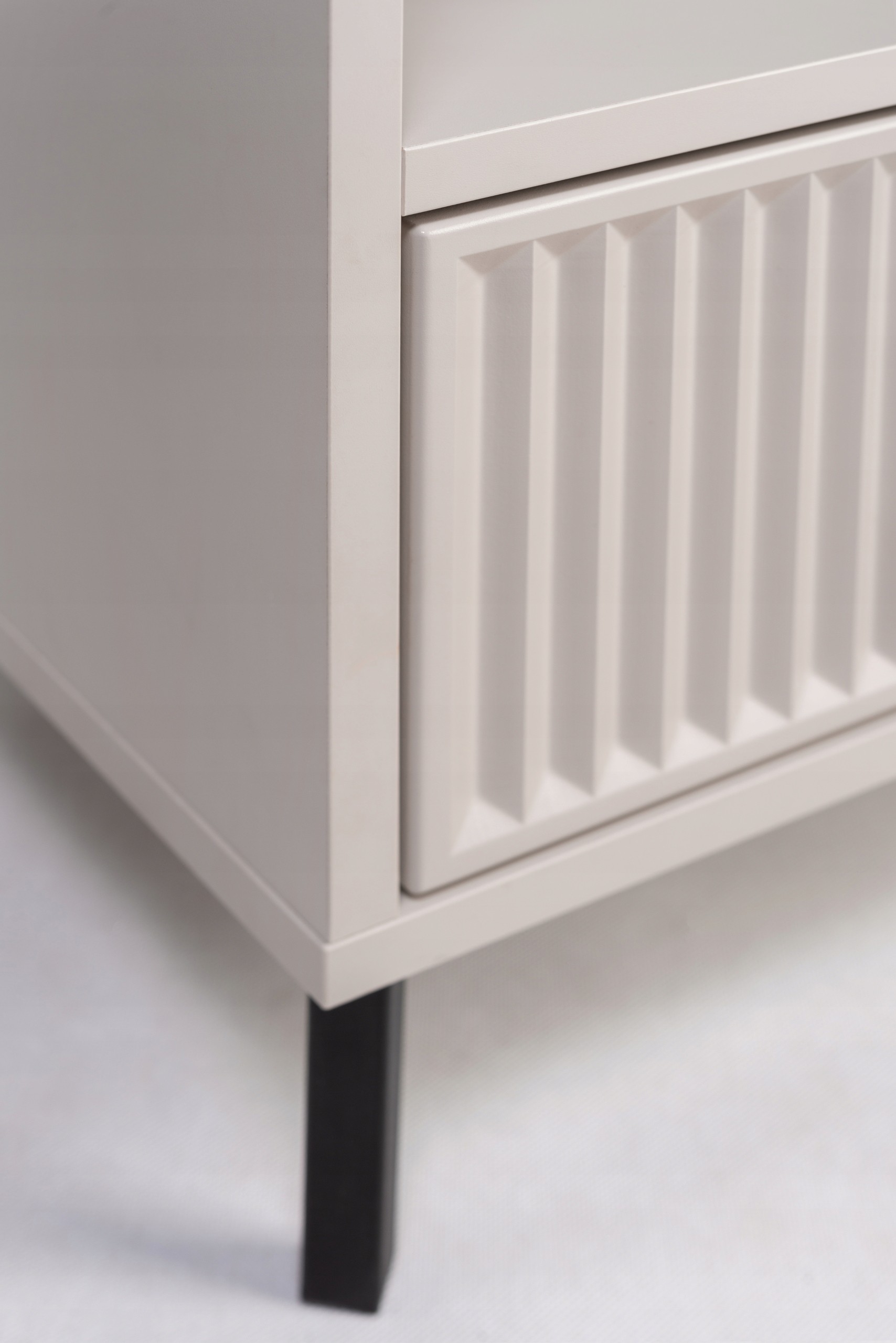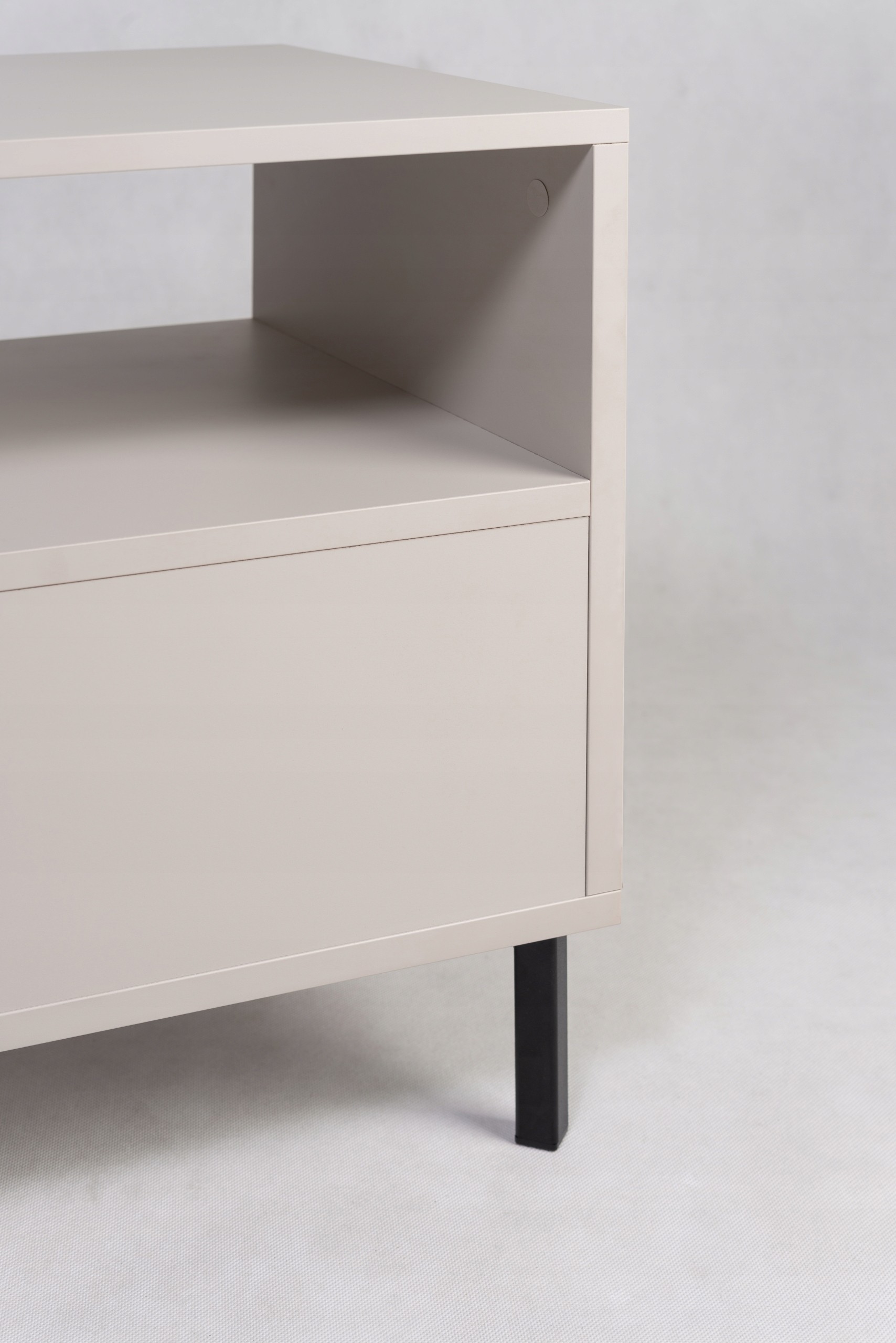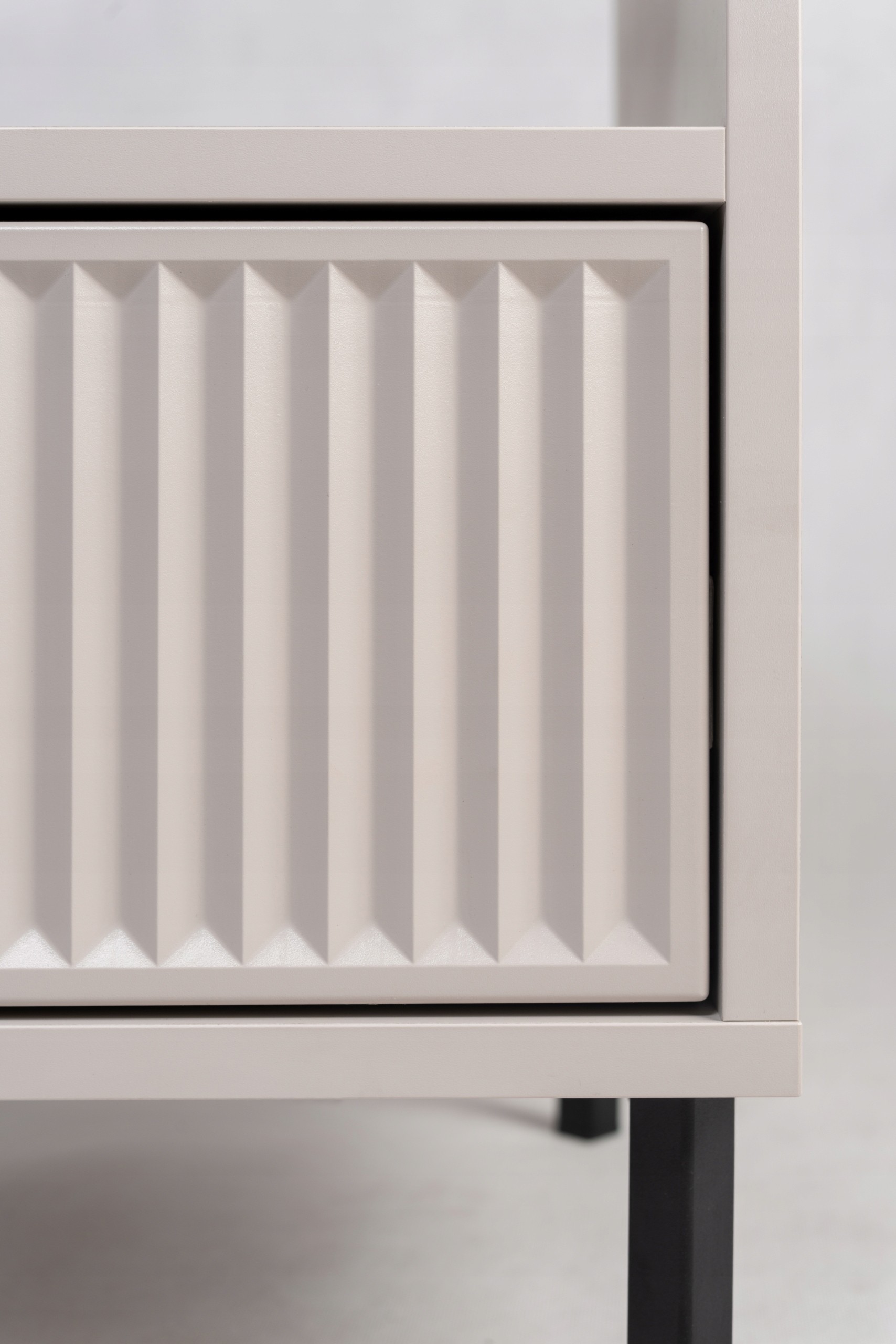 Zestaw 2 szafek nocnych KASZMIROWA to idealne uzupełnienie każdej sypialni. Stylowe, funkcjonalne i nowoczesne, doskonale pasują do mebli sypialnianych w różnych aranżacjach. Ich ryflowana szuflada oferuje dyskretną przestrzeń na drobiazgi, a otwarta półka to idealne miejsce na książki, budzik czy inne przedmioty, które chcesz mieć pod ręką. Czarne metalowe nogi dodają nowoczesnego charakteru, a subtelny kolor kaszmir wprowadza do wnętrza elegancję i harmonię. To doskonały wybór dla tych, którzy szukają mebli do sypialni łączących styl i funkcjonalność.
