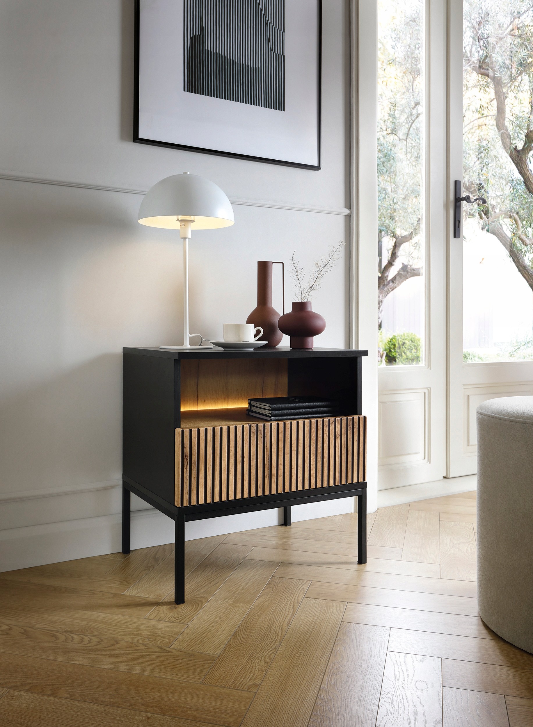 Szafka nocna z kolekcji SALI to doskonałe rozwiązanie do sypialni. Wyposażona w pojemną szufladę, zapewnia wystarczającą przestrzeń na przechowywanie drobnych przedmiotów, jak książki czy drobiazgi, które chcesz mieć pod ręką przy łóżku.