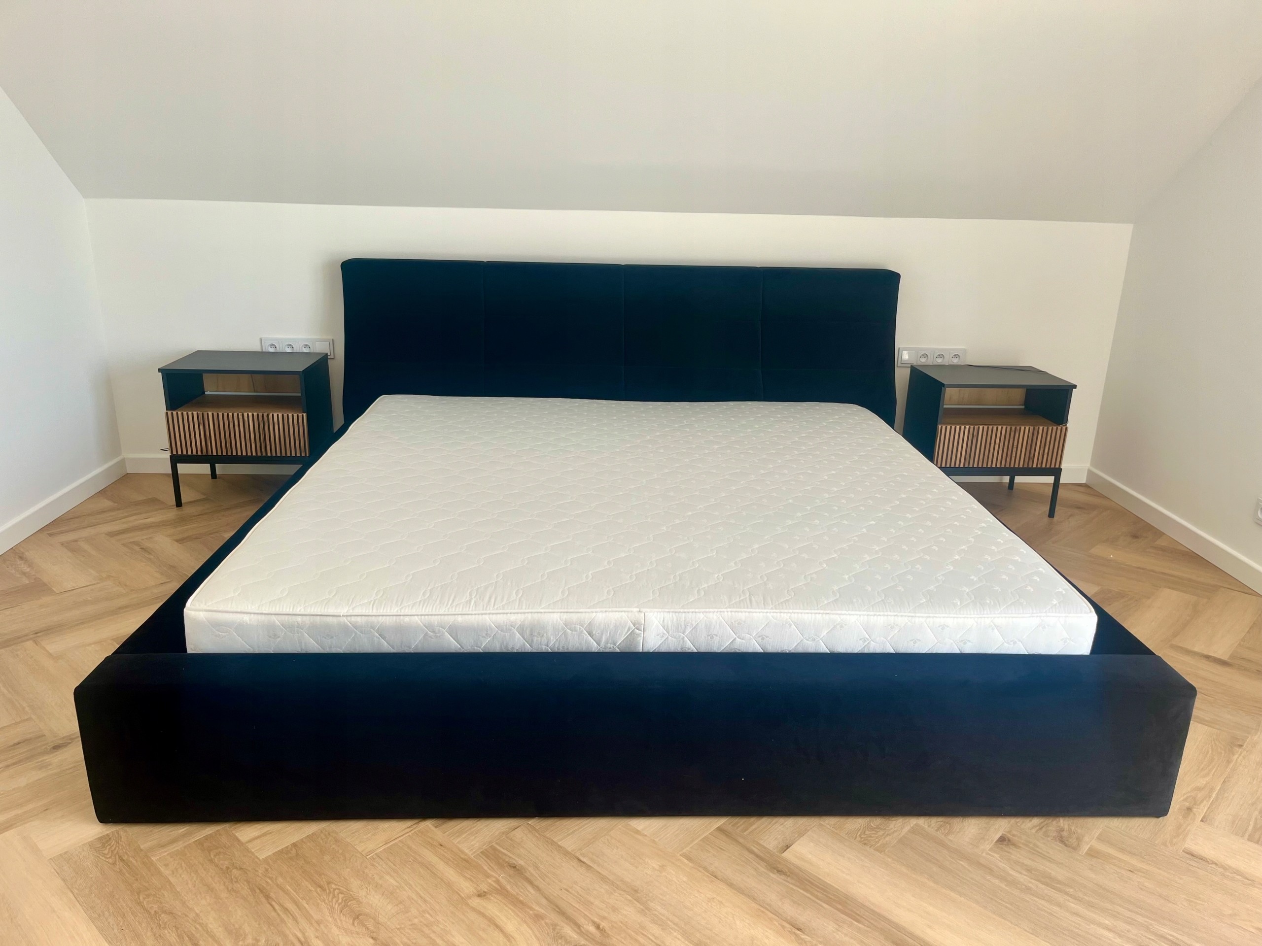 Front stolika nocnego w kolorze dąb wotan z eleganckimi frezowanymi detalami doskonale komponuje się z czarnym korpusem, tworząc nowoczesny i stylowy mebel. Szafka stoi na metalowych nóżkach, które nadają jej lekkości, a jednocześnie ułatwiają utrzymanie czystości w sypialni.