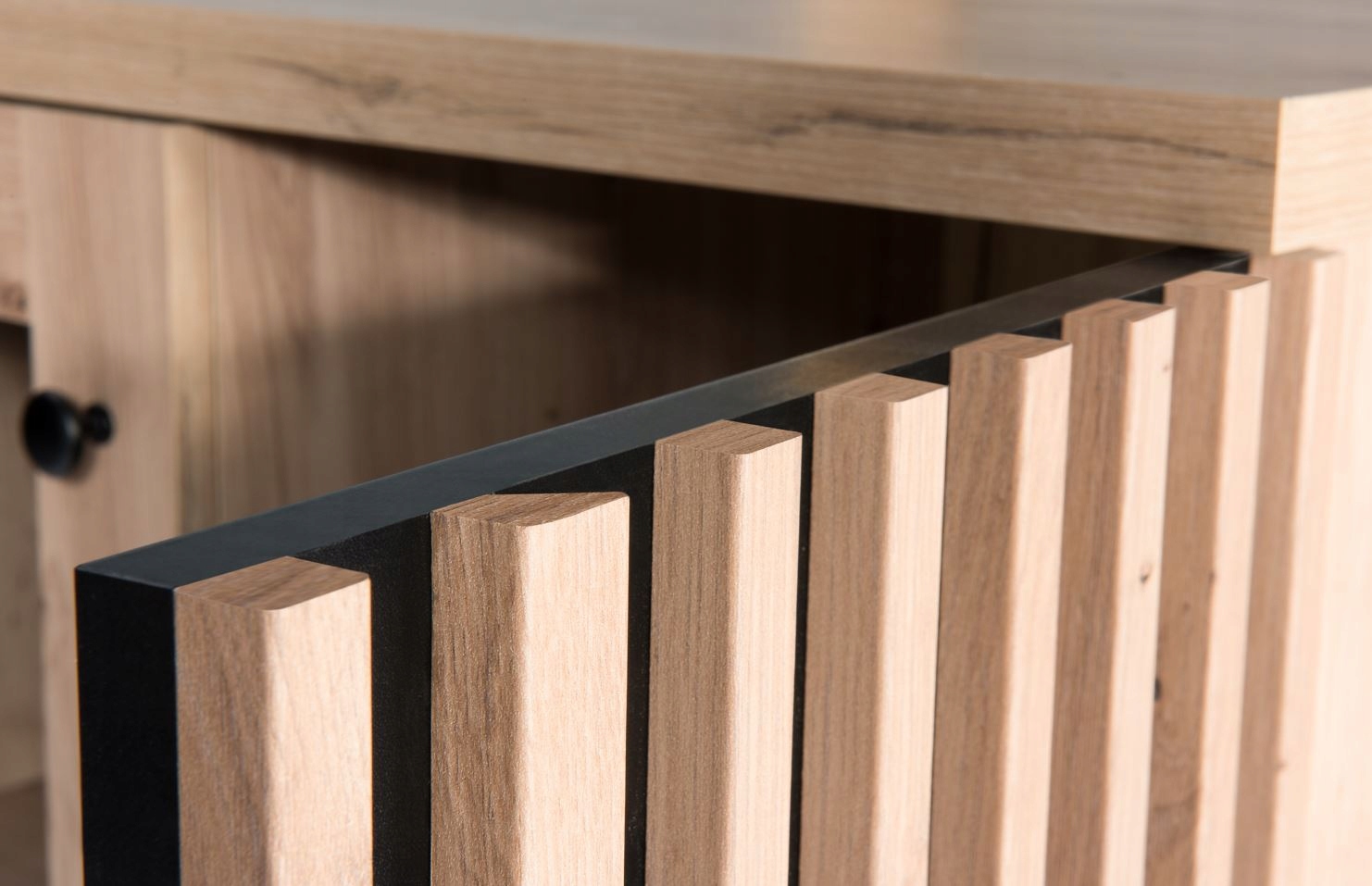 Innowacyjne lamelowe fronty nie tylko przyciągają wzrok, ale także nadają meblowi unikalny charakter. Metalowe uchwyty w klasycznym czarnym kolorze doskonale wpisują się w minimalistyczny trend, dodając całości elegancji.