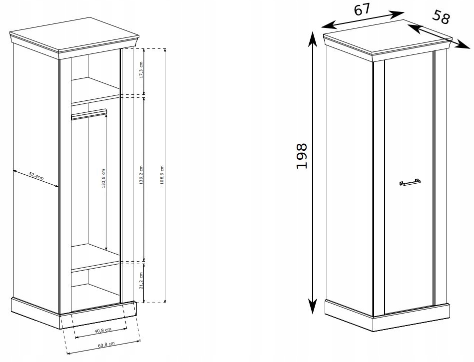 Szafa z kolekcji CANITA to stylowy i funkcjonalny mebel, idealny do sypialni lub przedpokoju. Dzięki jednym drzwiom, wieszakowi oraz półkom, oferuje wygodne miejsce do przechowywania odzieży i akcesoriów, zachowując jednocześnie elegancki wygląd.