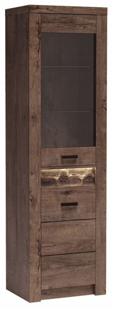 Dzięki przemyślanej konstrukcji, szafa oferuje przestronność i wygodny dostęp do przechowywanych rzeczy, co sprawia, że codzienne użytkowanie staje się przyjemnością. Ozdobna wstawka z głęboko ciosanego drewna sosnowego dodaje jej niepowtarzalnego charakteru, a opcjonalne oświetlenie podkreśla detale, tworząc przytulną atmosferę w każdym pomieszczeniu.