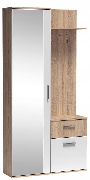 Szafa wyróżnia się rzeźbioną drewnianą wstawką, która tworzy interesujący kontrast z jasnymi frontami, nadając całości unikalnego charakteru. Dzięki metalowym uchwytom i pełnemu wysuwowi szuflad, oferuje zarówno funkcjonalność, jak i nowoczesny design. Opcjonalne oświetlenie podkreśli detale i nada wnętrzu przytulny nastrój.