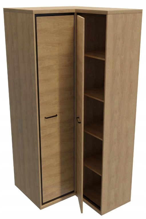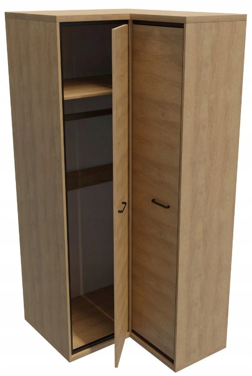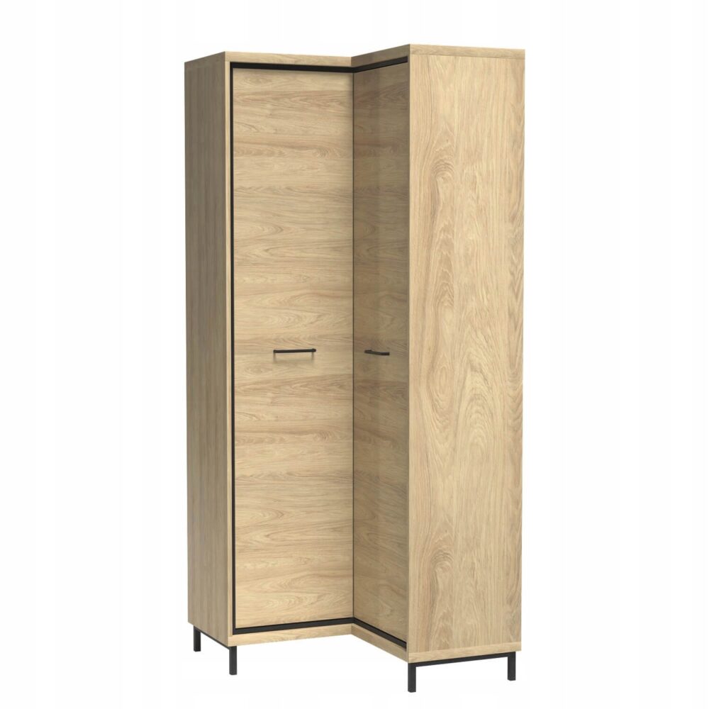 Szafa narożna z kolekcji MILAN to praktyczne i eleganckie rozwiązanie do sypialni lub przedpokoju. Wykonana w stylu industrialnym, w kolorze Natural Hikora, łączy nowoczesny wygląd z funkcjonalnością, dzięki metalowym uchwytom i cichym domykaniem drzwi. Wysokiej jakości obrzeże ABS zapewnia trwałość i odporność na uszkodzenia, a metalowe nóżki nadają jej lekkości i stabilności. Mebel oferuje pojemne wnętrze z miejscem na półki i wieszaki, idealne do organizacji przestrzeni. Możliwość dołożenia dodatkowego oświetlenia oraz półek pozwala na pełne dopasowanie szafy do potrzeb użytkownika, co czyni ją doskonałym wyborem do nowoczesnych wnętrz.