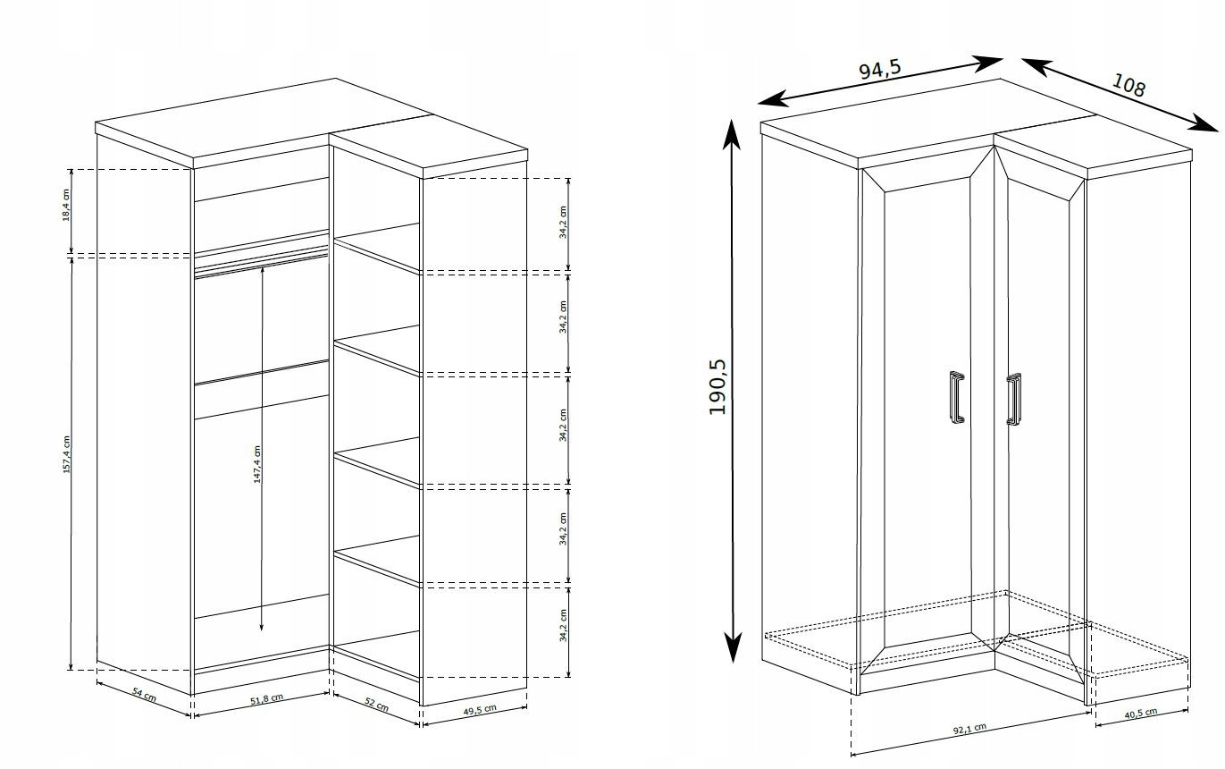Szafa narożna „Dąb Lefkas” to idealne rozwiązanie do każdego wnętrza, które łączy funkcjonalność z eleganckim, klasycznym designem. Dzięki narożnej konstrukcji pozwala maksymalnie wykorzystać przestrzeń, co czyni ją idealną do małych pomieszczeń. Pojemne półki i wieszak zapewniają doskonałą organizację ubrań i akcesoriów. Wykonana w stylu klasycznym, z wykończeniem w odcieniu dębu Lefkas, wprowadza ciepło i naturalny charakter do wnętrza. Szafa narożna do sypialni to doskonały wybór dla osób poszukujących stylowych i praktycznych rozwiązań meblowych.